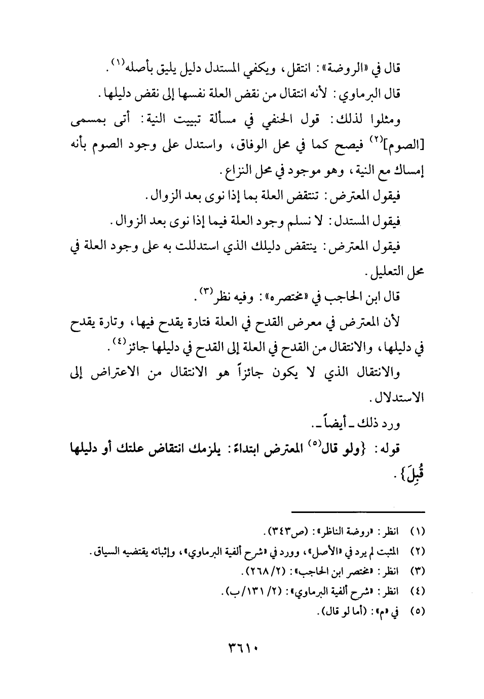 فَيَقُول الْمُعْتَرض: تنْتَقض الْعلَّة بِمَا إِذا نوى بعد الزَّوَال. فَيَقُول الْمُسْتَدلّ: لَا نسلم وجود الْعلَّة فِيمَا إِذا نوى بعد الزَّوَال فَيَقُول الْمُعْتَرض: ينْتَقض دليلك الَّذِي استدللت بِهِ على وجود الْعلَّة فِي مَحل التَّعْلِيل.