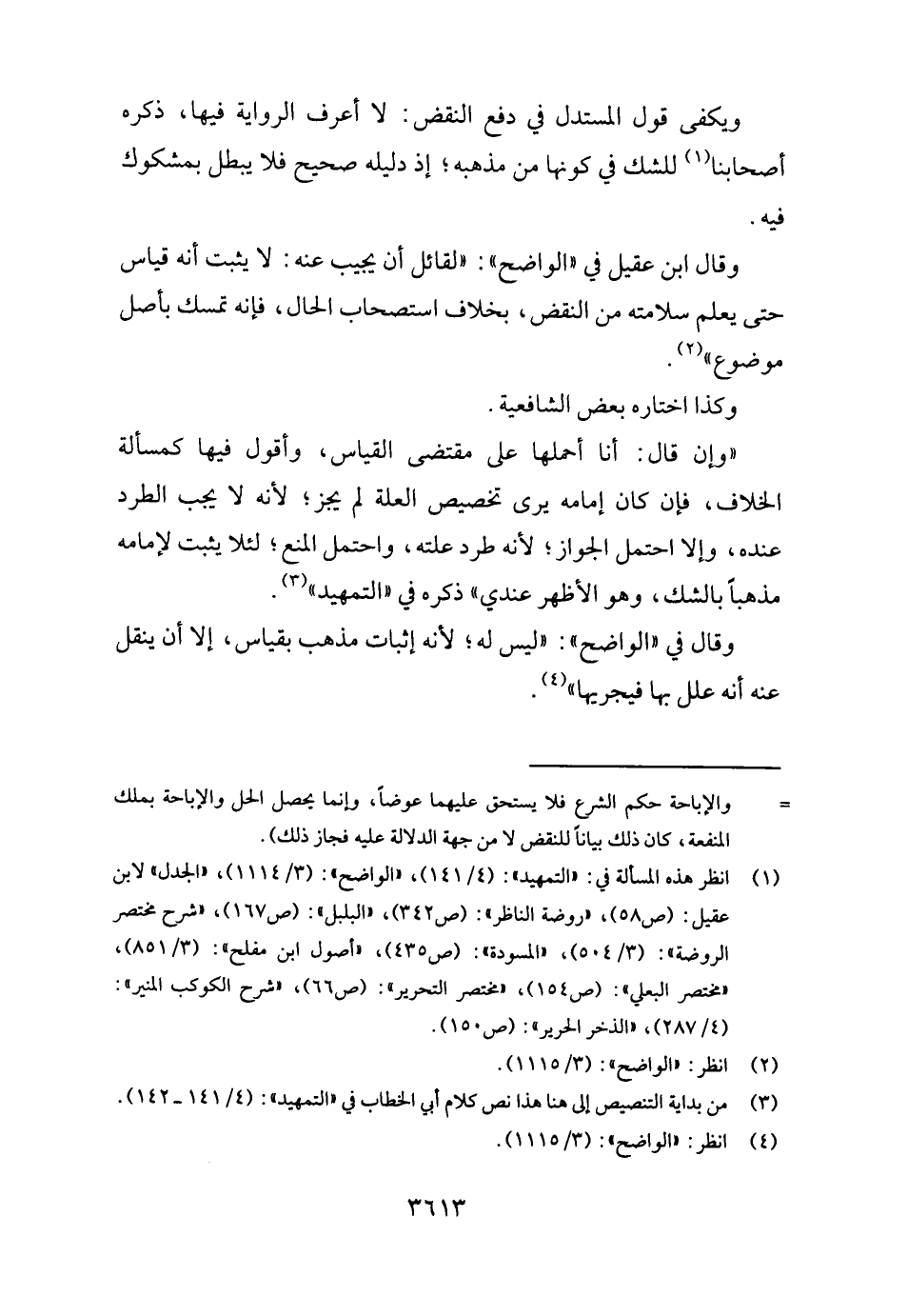 وَقَالَ ابْن عقيل فِي " الْوَاضِح ": " لقَائِل أَن يُجيب عَنهُ: لَا يثبت أَنه قِيَاس حَتَّى يعلم سَلَامَته من النَّقْض، بِخِلَاف اسْتِصْحَاب الْحَال، فَإِنَّهُ تمسك بِأَصْل مَوْضُوع ".