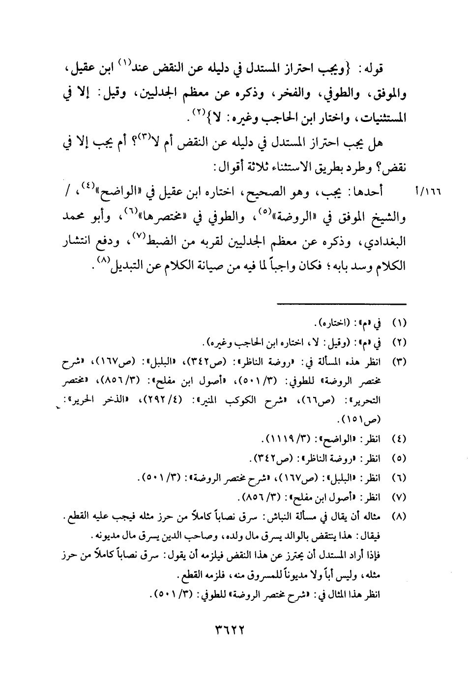 هَل يجب احْتِرَاز الْمُسْتَدلّ فِي دَلِيله عَن النَّقْض أم لَا؟ أم يجب إِلَّا فِي نقض؟ وطرد بطرِيق الِاسْتِثْنَاء ثَلَاثَة أَقْوَال: أَحدهَا: يجب، وَهُوَ الصَّحِيح، اخْتَارَهُ ابْن عقيل فِي " الْوَاضِح "، / وَالشَّيْخ الْمُوفق فِي " الرَّوْضَة "، والطوفي فِي " مختصرها "، , أَبُو مُحَمَّد الْبَغْدَادِيّ، وَذكره عَن مُعظم الجدليين لقُرْبه من الضَّبْط، وَدفع انتشار الْكَلَام وسد بَابه؛ فَكَانَ وَاجِبا لما فِيهِ من صِيَانة الْكَلَام عَن التبديل.