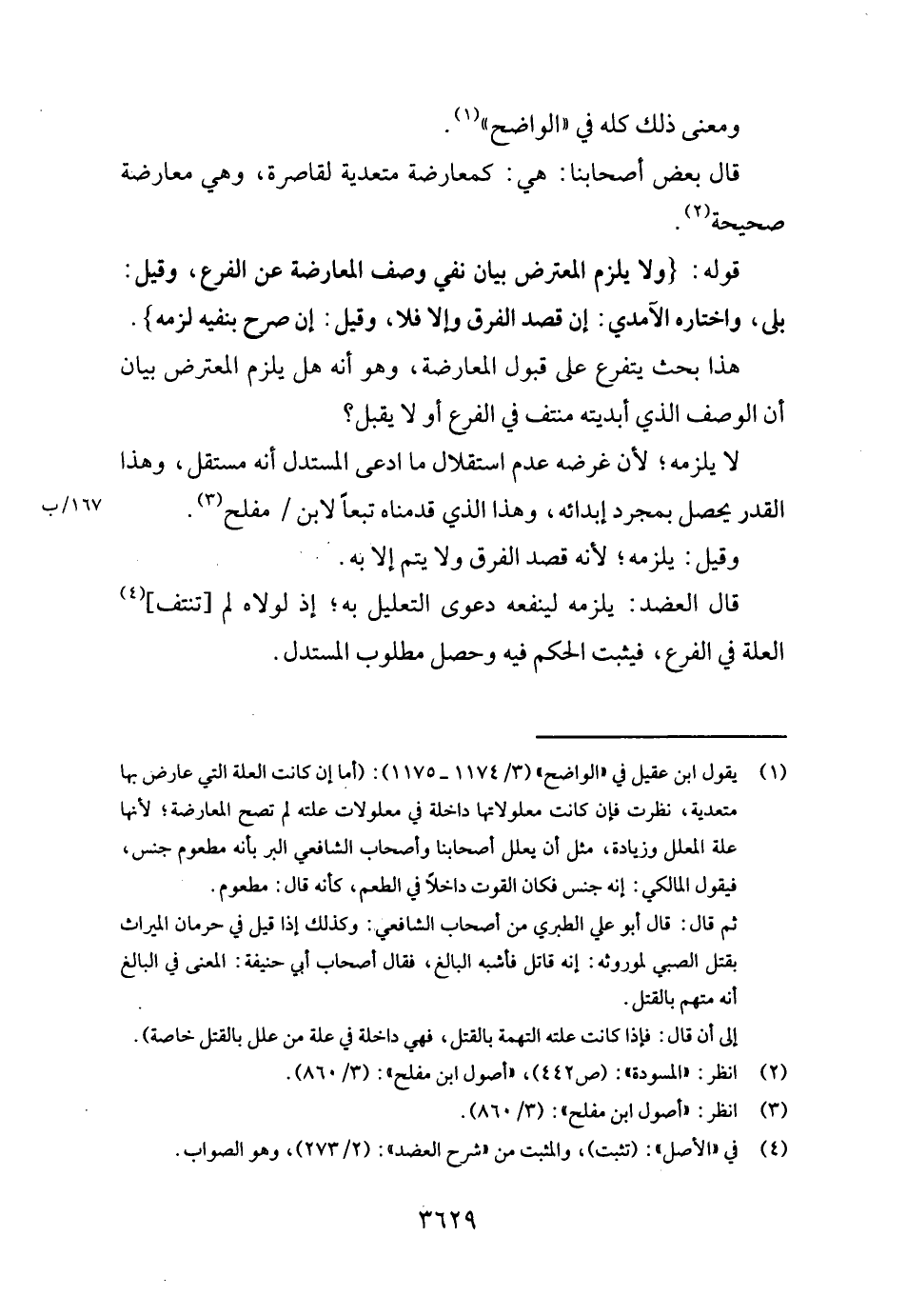 هَذَا بحث يتَفَرَّع على قبُول الْمُعَارضَة، وَهُوَ أَنه هَل يلْزم الْمُعْتَرض بَيَان أَن الْوَصْف الَّذِي أبديته مُنْتَفٍ فِي الْفَرْع أَو لَا يقبل؟