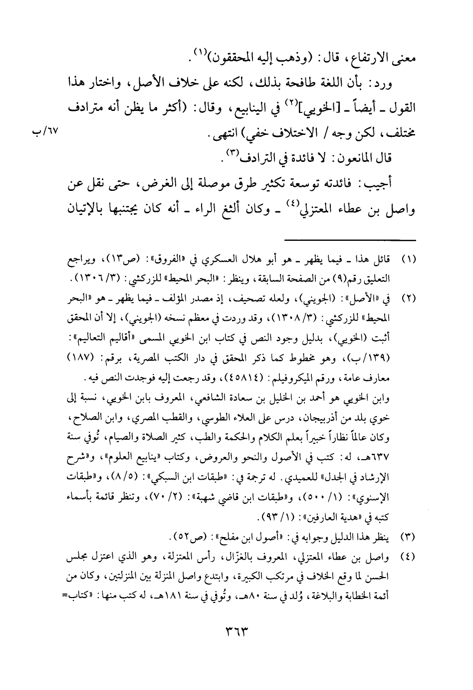ورد: بِأَن اللُّغَة طافحة بذلك، لكنه على خلاف الأَصْل، وَاخْتَارَ هَذَا القَوْل - أَيْضا -[الخويي] فِي الْيَنَابِيع، وَقَالَ: (أَكثر مَا يظنّ أَنه مترادف مُخْتَلف، لَكِن وَجه / الِاخْتِلَاف خَفِي) انْتهى.