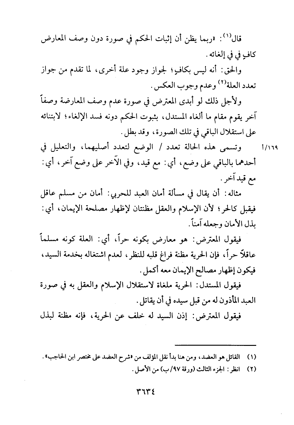 فَيَقُول الْمُعْتَرض: هُوَ معَارض بِكَوْنِهِ حرا، أَي: الْعلَّة كَونه مُسلما عَاقِلا حرا، فَإِن الْحُرِّيَّة مَظَنَّة فرَاغ قلبه للنَّظَر، لعدم اشْتِغَاله بِخِدْمَة السَّيِّد، فَيكون إِظْهَار مصَالح الْإِيمَان مَعَه أكمل.