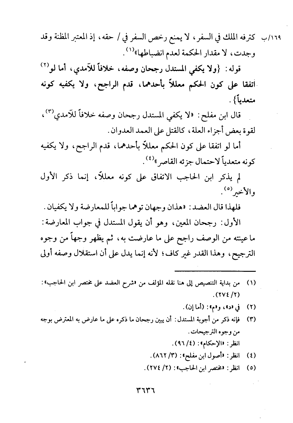 قَالَ ابْن مُفْلِح: " لَا يَكْفِي الْمُسْتَدلّ رُجْحَان وَصفه خلافًا للآمدي، لقُوَّة بعض أَجزَاء الْعلَّة، كَالْقَتْلِ على الْعمد الْعدوان.