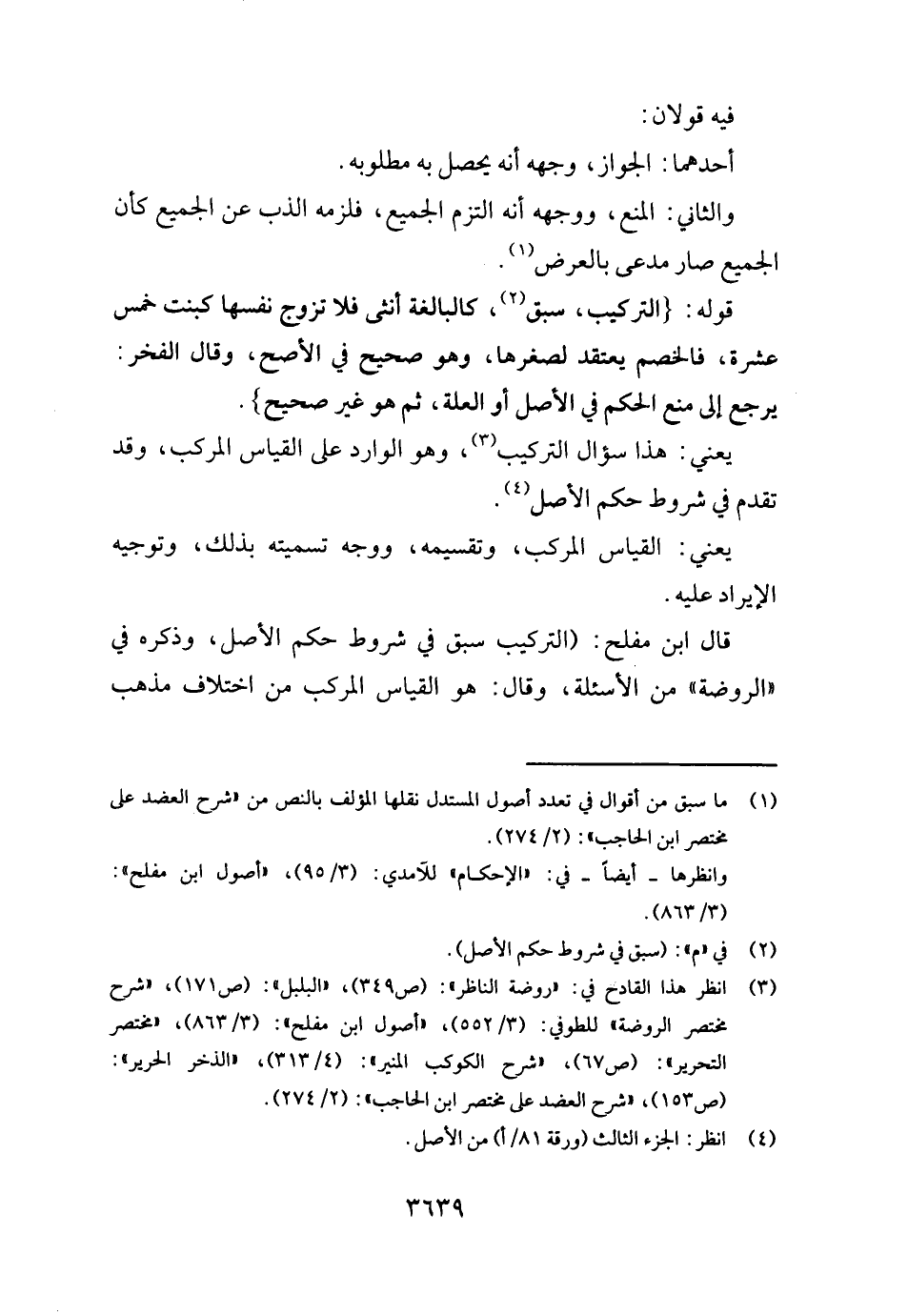 قَالَ ابْن مُفْلِح: (التَّرْكِيب سبق فِي شُرُوط حكم الأَصْل، وَذكره فِي " الرَّوْضَة " من الأسئلة، وَقَالَ: هُوَ الْقيَاس الْمركب من اخْتِلَاف مَذْهَب