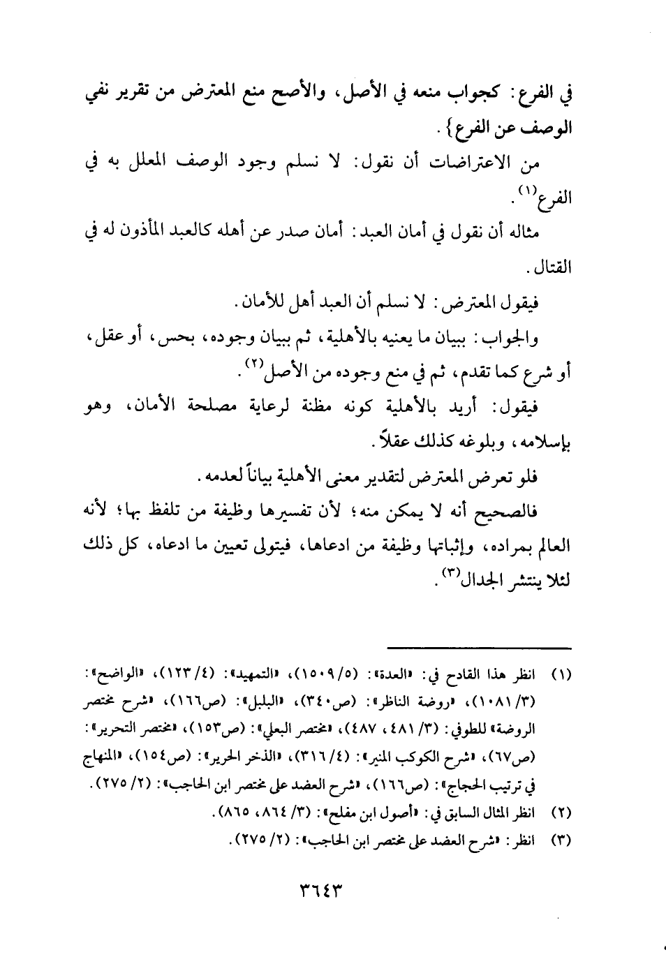 فِي الْفَرْع: كجواب مَنعه فِي الأَصْل، وَالأَصَح منع الْمُعْتَرض من تَقْرِير نفي الْوَصْف عَن الْفَرْع) . من الاعتراضات أَن نقُول: لَا نسلم وجود الْوَصْف الْمُعَلل بِهِ فِي الْفَرْع.