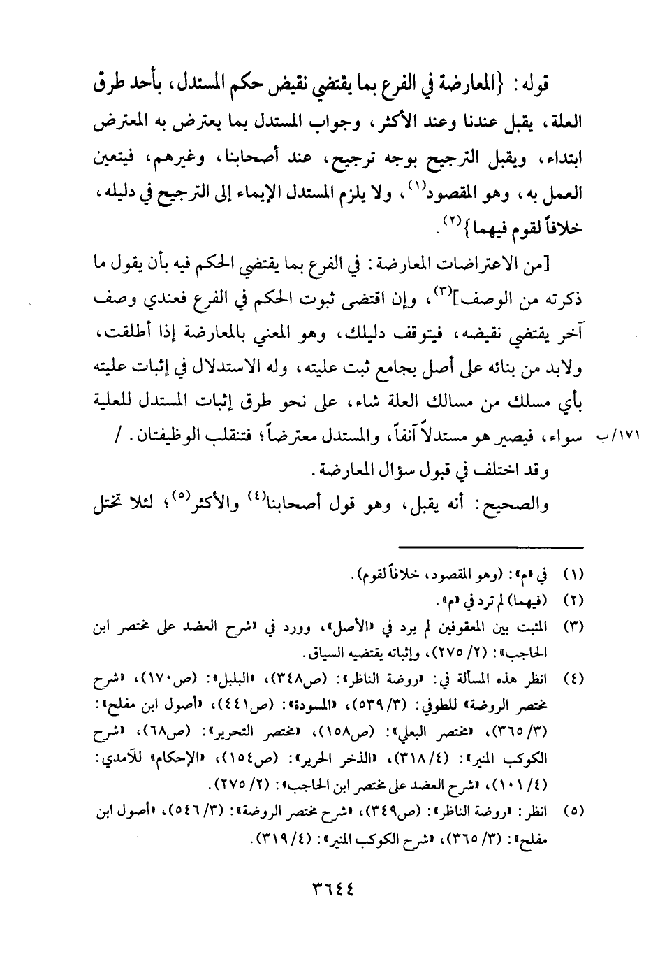 قَوْله: (الْمُعَارضَة فِي الْفَرْع بِمَا يَقْتَضِي نقيض حكم الْمُسْتَدلّ، بِأحد طرق الْعلَّة، يقبل عندنَا وَعند الْأَكْثَر، وَجَوَاب الْمُسْتَدلّ بِمَا يعْتَرض بِهِ الْمُعْتَرض ابْتِدَاء، وَيقبل التَّرْجِيح بِوَجْه تَرْجِيح، عِنْد أَصْحَابنَا، وَغَيرهم، فَيتَعَيَّن الْعَمَل بِهِ، وَهُوَ الْمَقْصُود، وَلَا يلْزم الْمُسْتَدلّ الْإِيمَاء إِلَى التَّرْجِيح فِي دَلِيله، خلافًا لقوم فيهمَا) .