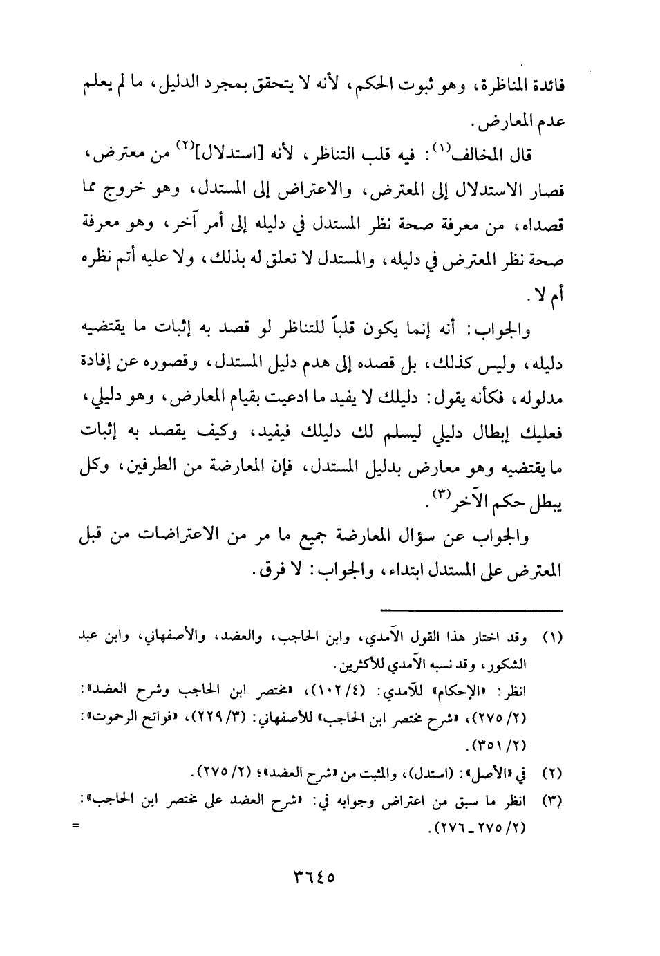 وَالْجَوَاب: أَنه إِنَّمَا يكون قلبا للتناظر لَو قصد بِهِ إِثْبَات مَا يَقْتَضِيهِ دَلِيله، وَلَيْسَ كَذَلِك، بل قَصده إِلَى هدم دَلِيل الْمُسْتَدلّ، وقصوره عَن إِفَادَة مَدْلُوله، فَكَأَنَّهُ يَقُول: دليلك لَا يُفِيد مَا ادعيت بِقِيَام الْمعَارض، وَهُوَ دليلي، فَعَلَيْك إبِْطَال دليلي ليسلم لَك دليلك فَيُفِيد، وَكَيف يقْصد بِهِ إِثْبَات مَا يَقْتَضِيهِ وَهُوَ معَارض بِدَلِيل الْمُسْتَدلّ فَإِن الْمُعَارضَة من الطَّرفَيْنِ، وكل يبطل حكم الآخر.