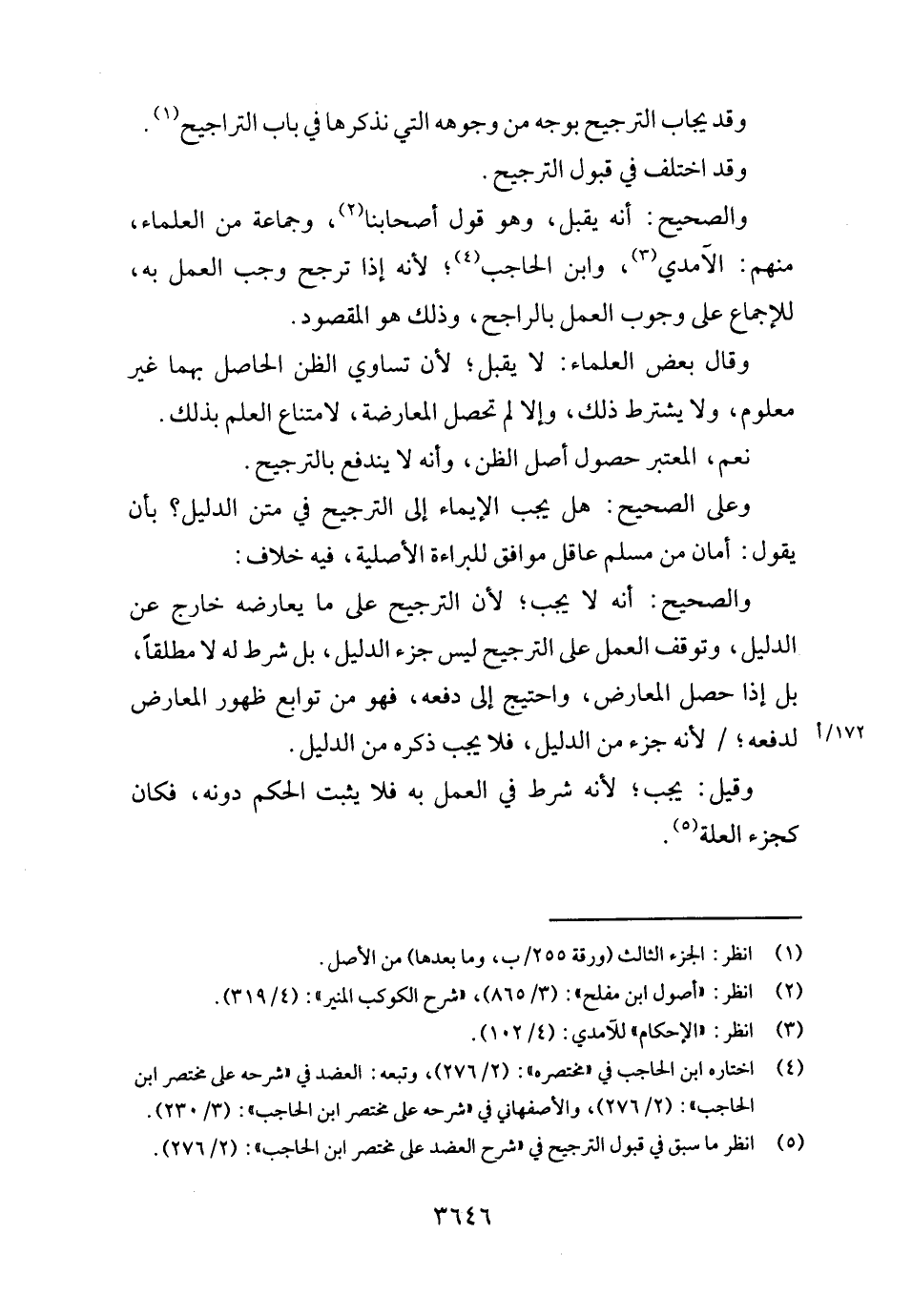 وَالصَّحِيح: أَنه لَا يجب؛ لِأَن التَّرْجِيح على مَا يُعَارضهُ خَارج عَن الدَّلِيل، وَتوقف الْعَمَل على التَّرْجِيح لَيْسَ جُزْء الدَّلِيل، بل شَرط لَهُ لَا مُطلقًا بل إِذا حصل الْمعَارض، واحتيج إِلَى دَفعه، فَهُوَ من تَوَابِع ظُهُور الْمعَارض لدفعه؛ / لِأَنَّهُ جُزْء من الدَّلِيل فَلَا يجب ذكره من الدَّلِيل.