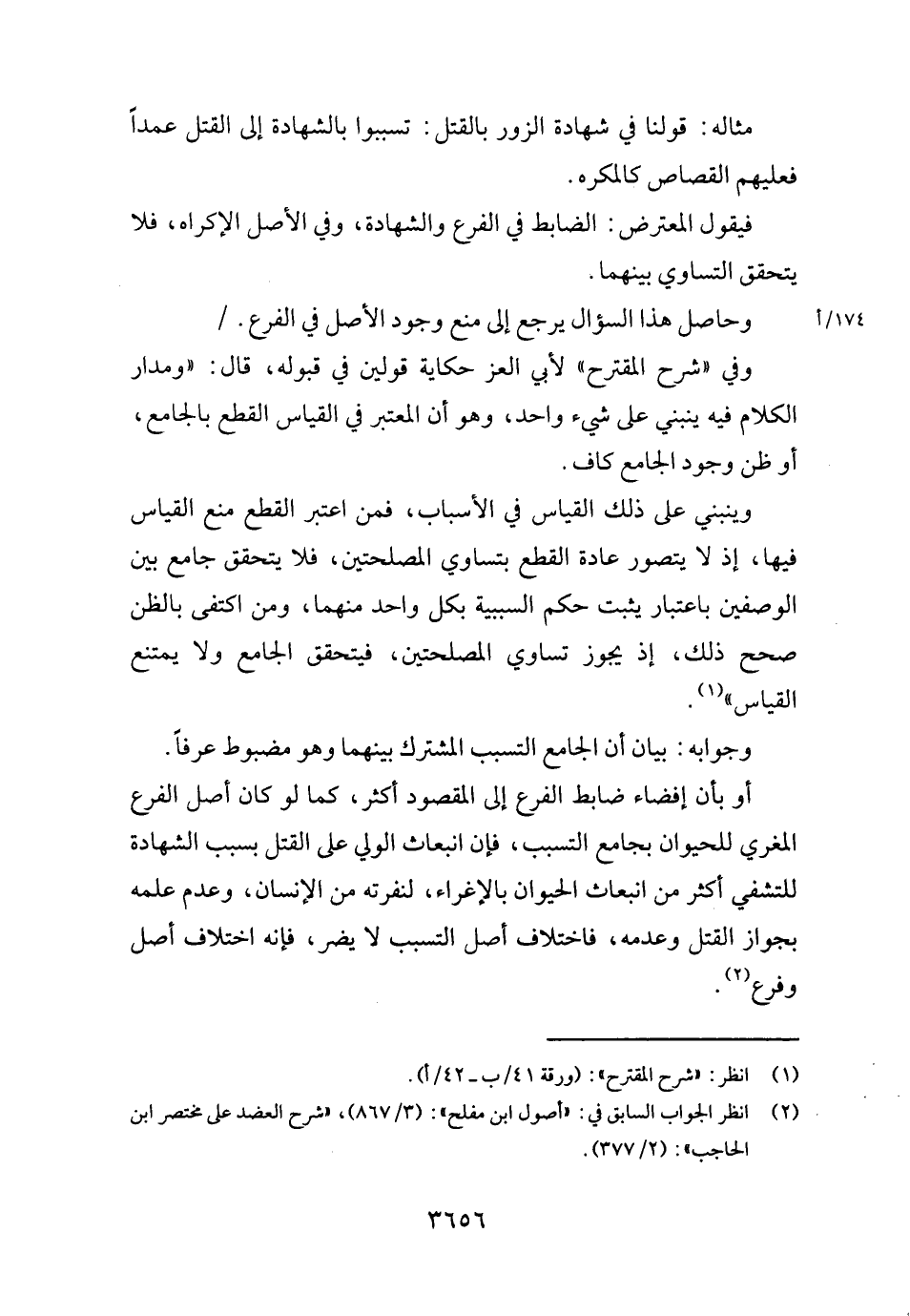 وَجَوَابه: بَيَان أَن الْجَامِع التَّسَبُّب الْمُشْتَرك بَينهمَا وَهُوَ مضبوط عرفا. أَو بِأَن إفضاء ضَابِط الْفَرْع إِلَى الْمَقْصُود أَكثر، كَمَا لَو كَانَ أصل الْفَرْع المغري للحيوان بِجَامِع التَّسَبُّب، فَإِن انبعاث الْوَلِيّ على الْقَتْل بِسَبَب الشَّهَادَة للتشفي أَكثر من انبعاث الْحَيَوَان بالإغراء، لنفرته من الْإِنْسَان، وَعدم علمه بِجَوَاز الْقَتْل وَعَدَمه، فاختلاف أصل التَّسَبُّب لَا يضر، فَإِنَّهُ اخْتِلَاف أصل وَفرع.