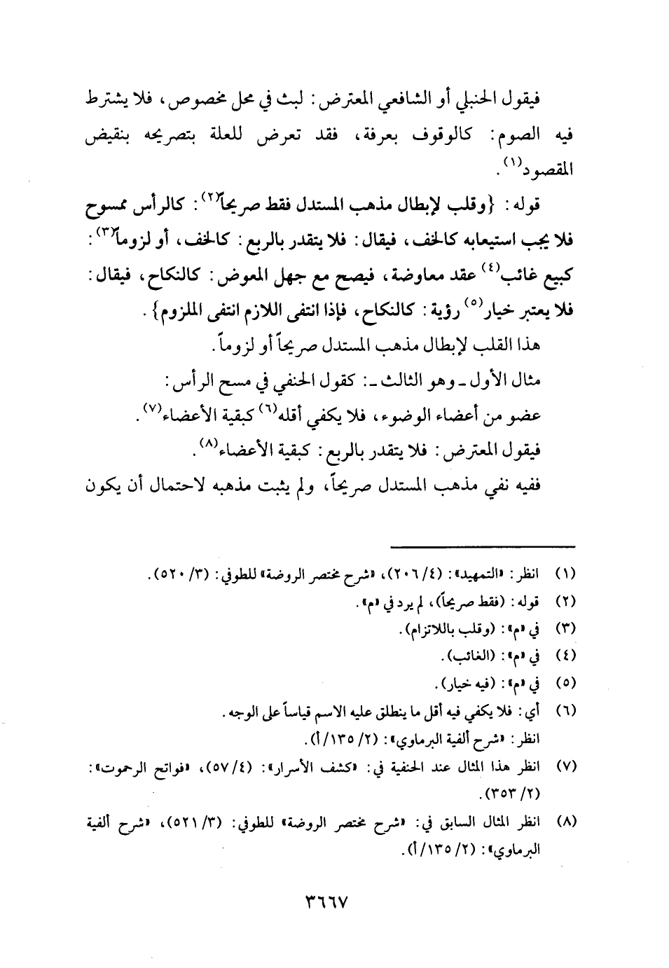 قَوْله: (وقلب لإبطال مَذْهَب الْمُسْتَدلّ فَقَط صَرِيحًا: كالرأس مَمْسُوح فَلَا يجب استيعابه كالخف، فَيُقَال: فَلَا يتَقَدَّر بِالربعِ: كالخف، أَو لُزُوما: كَبيع غَائِب عقد مُعَاوضَة، فَيصح مَعَ جهل المعوض: كَالنِّكَاحِ، فَيُقَال: فَلَا يعْتَبر خِيَار رُؤْيَة: كَالنِّكَاحِ، فَإِذا انْتَفَى اللَّازِم انْتَفَى الْمَلْزُوم) .