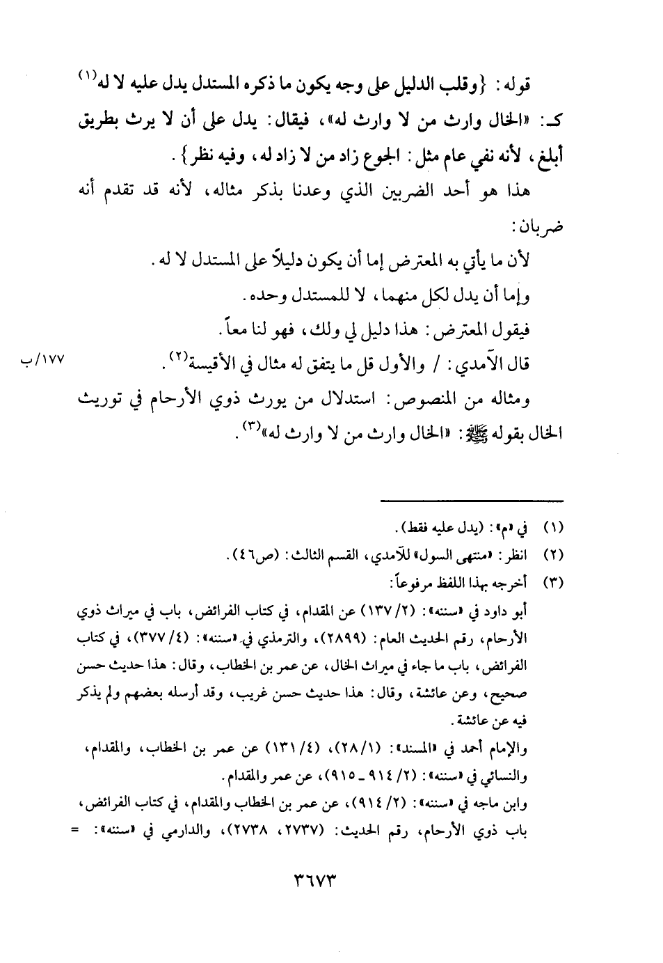 قَوْله: (وقلب الدَّلِيل على وَجه يكون مَا ذكره الْمُسْتَدلّ يدل عَلَيْهِ لَا لَهُ ك: " الْخَال وَارِث من لَا وَارِث لَهُ " فَيُقَال يدل على أَن لَا يَرث بطرِيق أبلغ، لِأَنَّهُ نفي عَام مثل: الْجُوع زَاد من لَا زَاد لَهُ، وَفِيه نظر) .