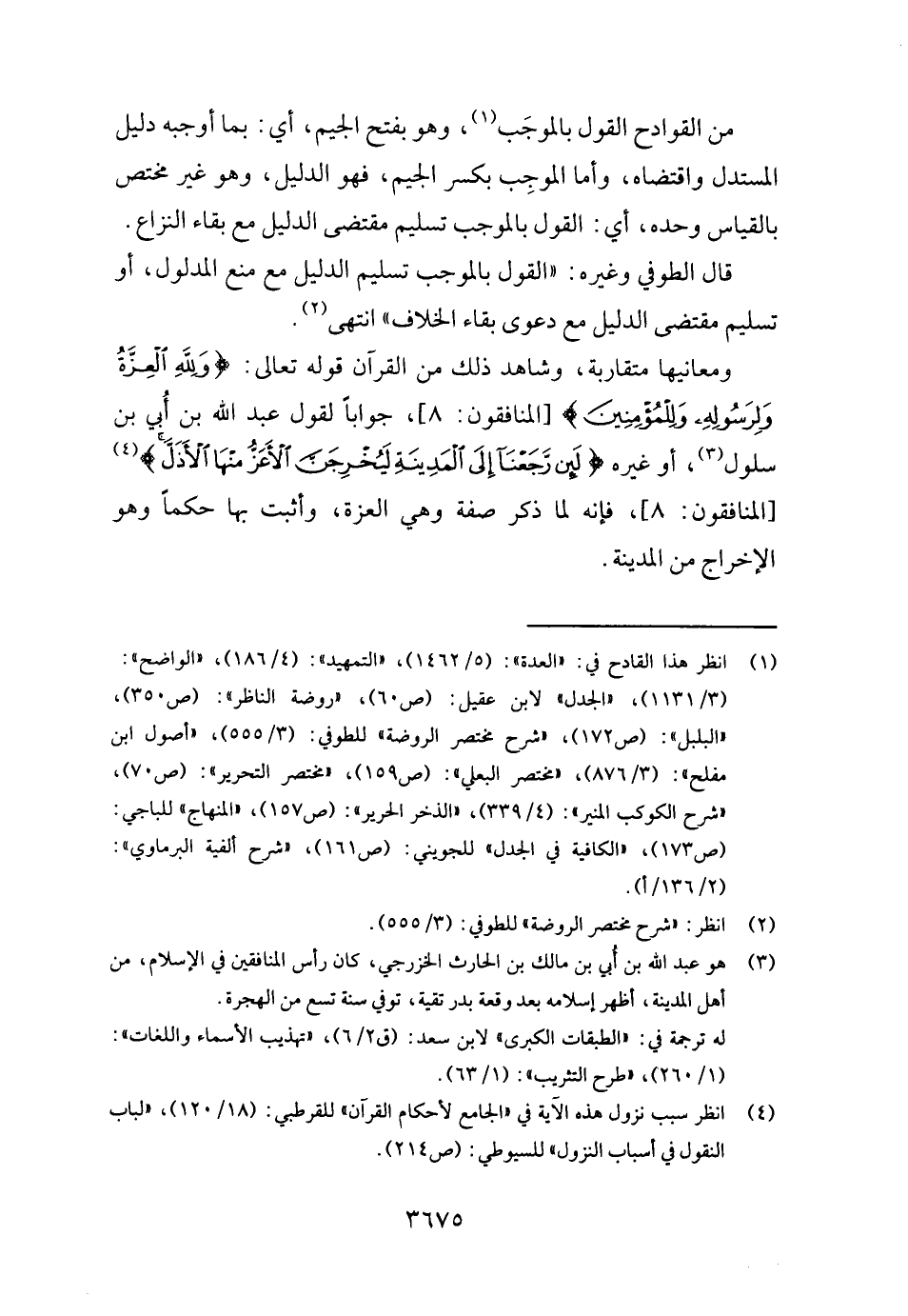 قَالَ الطوفي وَغَيره: " القَوْل بِالْمُوجبِ تَسْلِيم الدَّلِيل مَعَ منع الْمَدْلُول، أَو تَسْلِيم مُقْتَضى الدَّلِيل مَعَ دَعْوَى بَقَاء الْخلاف " انْتهى.