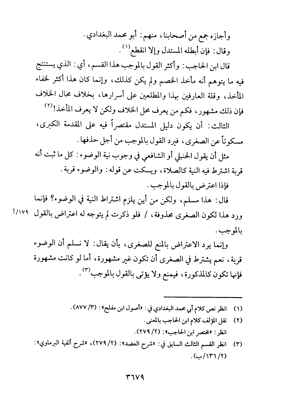 الثَّالِث: أَن يكون دَلِيل الْمُسْتَدلّ مُقْتَصرا فِيهِ على الْمُقدمَة الْكُبْرَى، مسكوتا عَن الصُّغْرَى، فَيرد القَوْل بِالْمُوجبِ من أجل حذفهَا.