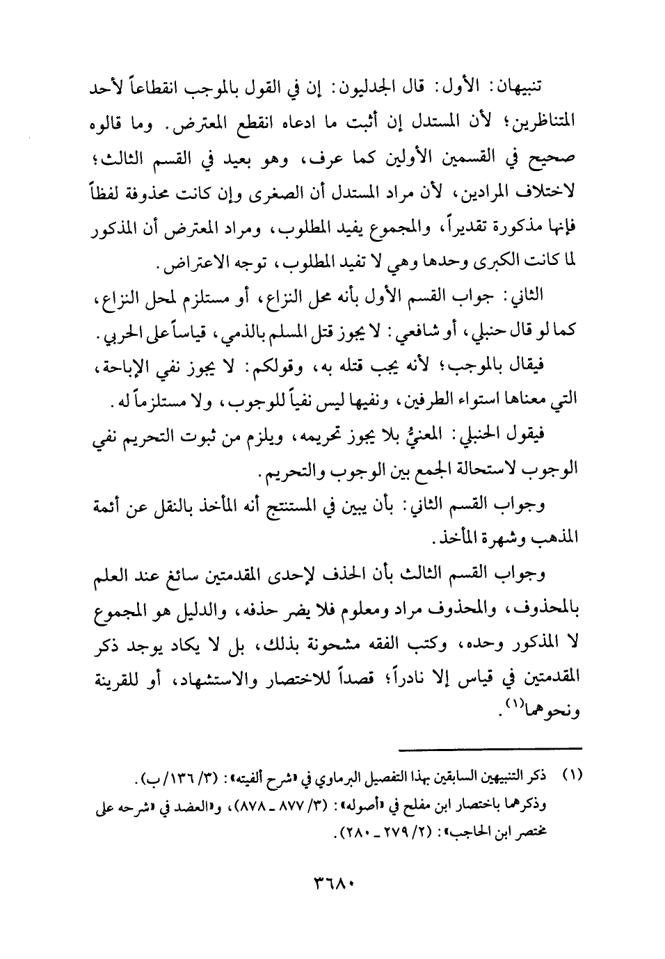 وَجَوَاب الْقسم الثَّالِث بِأَن الْحَذف لإحدى المقدمتين سَائِغ عِنْد الْعلم بالمحذوف، والمحذوف مُرَاد وَمَعْلُوم فَلَا يضر حذفه، وَالدَّلِيل هُوَ الْمَجْمُوع لَا الْمَذْكُور وَحده، وَكتب الْفِقْه مشحونة بذلك، بل لَا يكَاد يُوجد ذكر المقدمتين فِي قِيَاس إِلَّا نَادرا؛ قصدا للاختصار والاستشهاد، أَو للقرينة وَنَحْوهمَا.