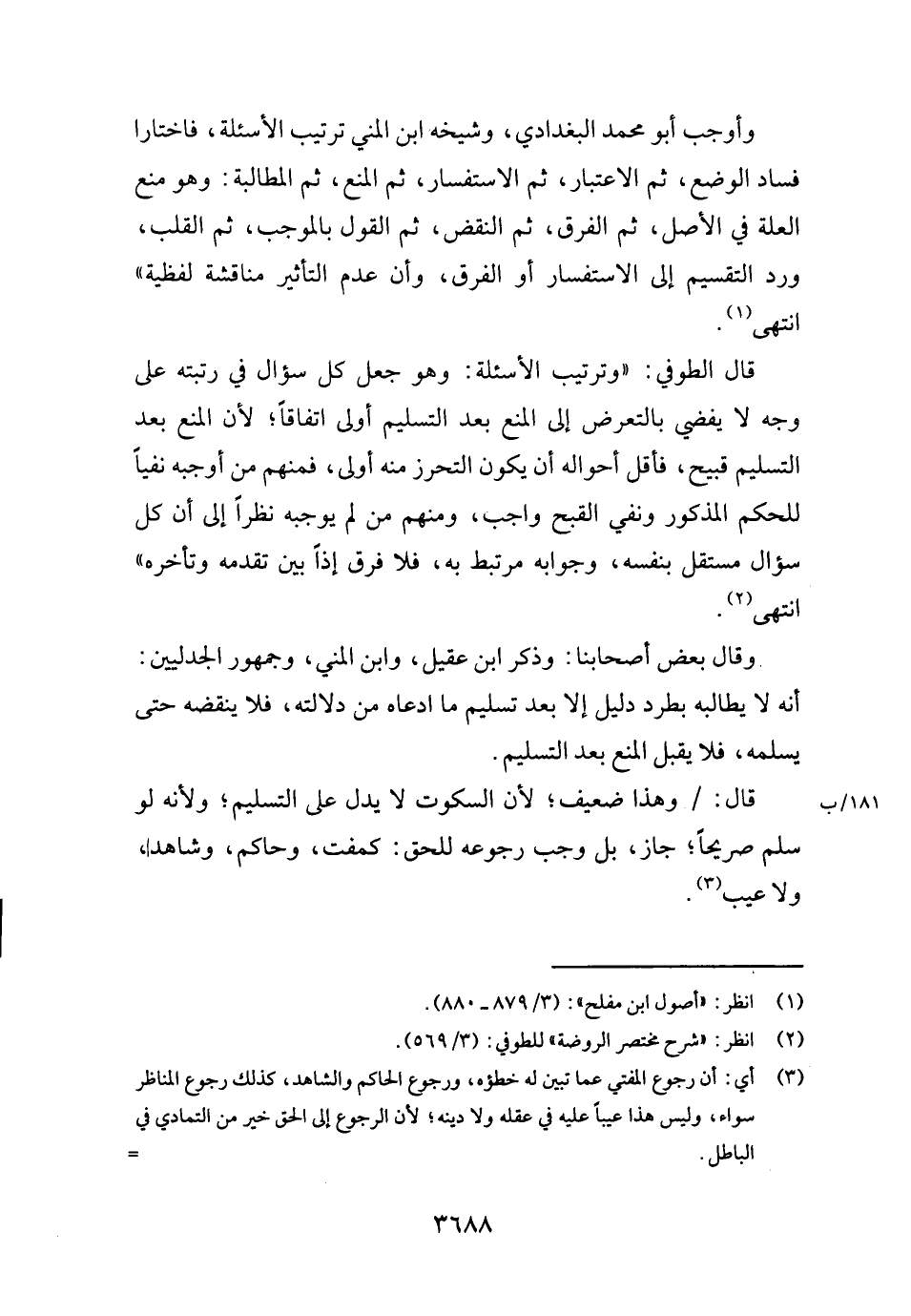 وَأوجب أَبُو مُحَمَّد الْبَغْدَادِيّ، وَشَيْخه ابْن الْمَنِيّ تَرْتِيب الأسئلة، فاختارا فَسَاد الْوَضع، ثمَّ الِاعْتِبَار، ثمَّ الاستفسار، ثمَّ الْمَنْع، ثمَّ الْمُطَالبَة: وَهُوَ منع الْعلَّة فِي الأَصْل، ثمَّ الْفرق، ثمَّ النَّقْض، ثمَّ القَوْل بِالْمُوجبِ، ثمَّ الْقلب، ورد التَّقْسِيم إِلَى الاستفسار أَو الْفرق، وَأَن عدم التَّأْثِير مناقشة لفظية " انْتهى.