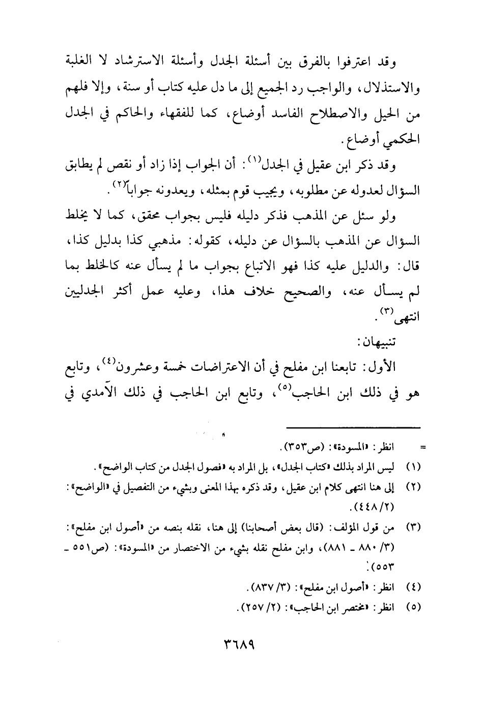 وَقد اعْتَرَفُوا بِالْفرقِ بَين أسئلة الجدل وأسئلة الاسترشاد لَا الْغَلَبَة وَالِاسْتِدْلَال وَالْوَاجِب رد الْجَمِيع إِلَى مَا دلّ عَلَيْهِ كتاب أَو سنة، وَإِلَّا فَلهم من الْحِيَل والاصطلاح الْفَاسِد أوضاع، كَمَا للفقهاء وَالْحَاكِم فِي الجدل الْحكمِي أوضاع.