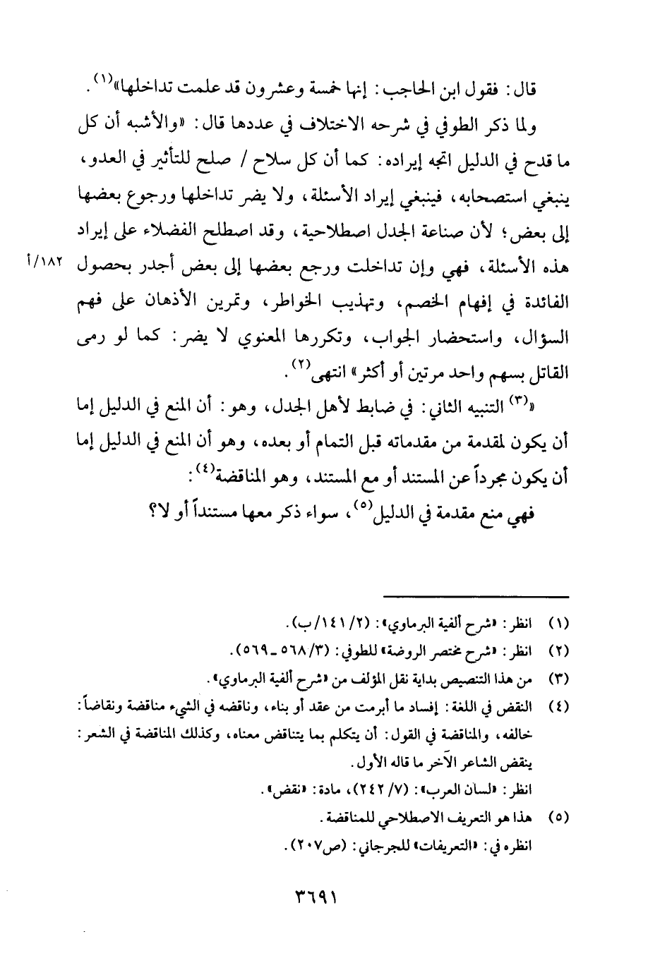 وَلما ذكر الطوفي فِي شَرحه الِاخْتِلَاف فِي عَددهَا قَالَ: " وَالْأَشْبَه أَن كل مَا قدح فِي الدَّلِيل اتجه إِيرَاده: كَمَا أَن كل سلَاح / صلح للتأثير فِي الْعَدو، يَنْبَغِي استصحابه، فَيَنْبَغِي إِيرَاد الأسئلة، وَلَا يضر تداخلها وَرُجُوع بَعْضهَا إِلَى بعض، لِأَن صناعَة الجدل اصطلاحية، وَقد اصْطلحَ الْفُضَلَاء على إِيرَاد هَذِه الأسئلة، فَهِيَ وَإِن تداخلت وَرجع بَعْضهَا إِلَى بعض أَجْدَر بِحُصُول الْفَائِدَة فِي إفهام الْخصم، وتهذيب الخواطر، وتمرين الأذهان على فهم السُّؤَال، واستحضار الْجَواب، وتكررها الْمَعْنَوِيّ لَا يضر: كَمَا لَو رمى الْقَاتِل بِسَهْم وَاحِد مرَّتَيْنِ أَو أَكثر " انْتهى.