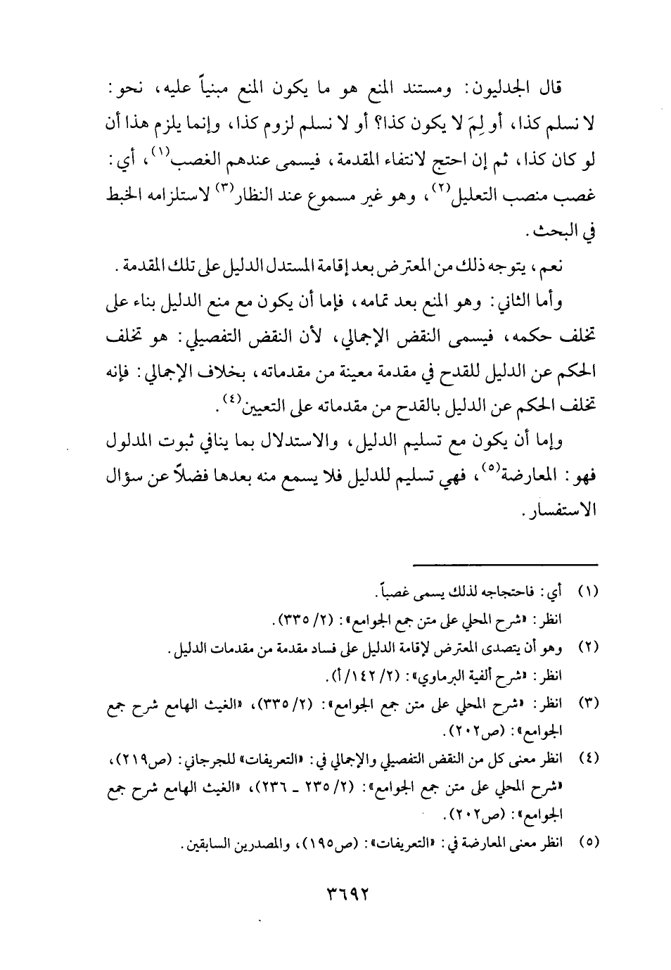 قَالَ الجدليون: ومستند الْمَنْع هُوَ مَا يكون الْمَنْع مَبْنِيا عَلَيْهِ، نَحْو: لَا نسلم كَذَا، أَو لم لَا يكون كَذَا؟ أَو لَا نسلم لُزُوم كَذَا، وَإِنَّمَا يلْزم هَذَا ان لَو كَانَ كَذَا، ثمَّ إِن احْتج لانْتِفَاء الْمُقدمَة، فيسمى عِنْدهم الْغَصْب، أَي: غصب منصب التَّعْلِيل، وَهُوَ غير مسموع عِنْد النظار لاستلزامه الْخبط فِي الْبَحْث.