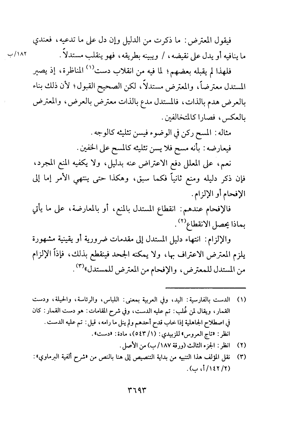 فَلهَذَا لم يقبله بَعضهم؛ لما فِيهِ من انقلاب دست المناظرة، إِذْ يصير الْمُسْتَدلّ مُعْتَرضًا، والمعترض مستدلا، لَكِن الصَّحِيح الْقبُول؛ لِأَن ذَلِك بِنَاء بِالْعرضِ هدم بِالذَّاتِ، فالمستدل مُدع بِالذَّاتِ معترض بِالْعرضِ، والمعترض بِالْعَكْسِ، فصارا كالمتخالفين.
