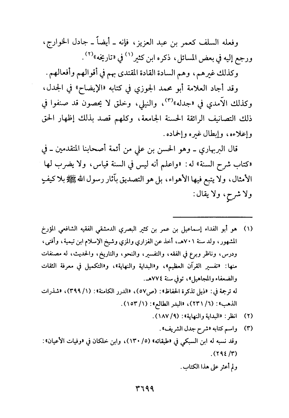 قَالَ البربهاري - وَهُوَ الْحسن بن عَليّ من أَئِمَّة أَصْحَابنَا الْمُتَقَدِّمين - فِي " كتاب شرح السّنة " لَهُ: " وَاعْلَم أَنه لَيْسَ فِي السّنة قِيَاس، وَلَا يضْرب لَهَا الْأَمْثَال، وَلَا يتبع فِيهَا الْأَهْوَاء، بل هُوَ التَّصْدِيق بآثار رَسُول اللَّهِ - صَلَّى اللَّهُ عَلَيْهِ وَسَلَّم َ - بِلَا كَيفَ وَلَا شرح، وَلَا يُقَال: