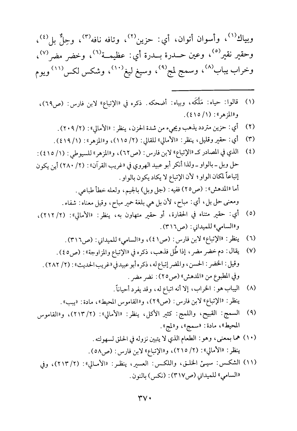 وبياك، وأسوان أتوان، أَي: حَزِين، وتافه نافه، وَحل بل، وحقير نقير، وَعين حدرة بدرة أَي: عَظِيمَة، وخضر مُضر، وخراب يباب، وسمج لمج، وسيغ ليغ، وشكس لكس وَيَوْم