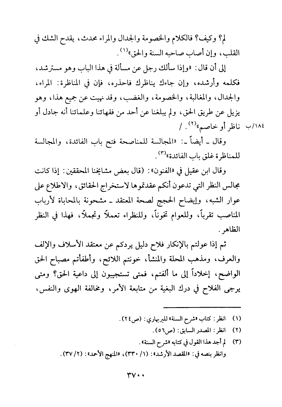 إِلَى أَن قَالَ: " وَإِذا سَأَلَك رجل عَن مَسْأَلَة فِي هَذَا الْبَاب وَهُوَ مسترشد، فَكَلمهُ وأرشده، وَإِن جَاءَك يناظرك فاحذره، فَإِن فِي المناظرة: المراء، والجدال، والمغالبة، وَالْخُصُومَة، وَالْغَضَب، وَقد نهيت عَن جَمِيع هَذَا، وَهُوَ يزِيل عَن طَرِيق الْحق، وَلم يبلغنَا عَن أحد من فقهائنا وعلمائنا أَنه جادل أَو نَاظر أَو خَاصم ". /