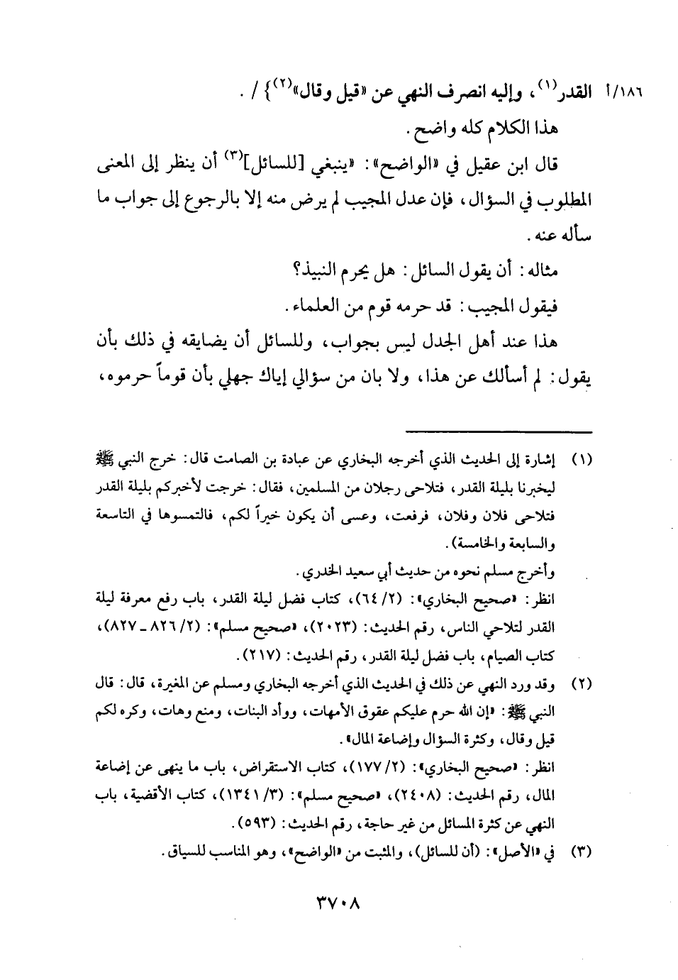 مِثَاله: أَن يَقُول السَّائِل: هَل يحرم النَّبِيذ؟
