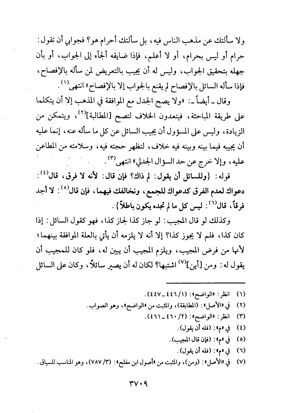 وَلَا سَأَلتك عَن مَذْهَب النَّاس فِيهِ، بل سَأَلتك أحرام هُوَ؟ فجوابي أَن تَقول: حرَام أَو لَيْسَ بِحرَام، أَو لَا أعلم، فَإِذا ضايقه أَلْجَأَهُ إِلَى الْجَواب، أَو بِأَن جَهله بتحقيق الْجَواب، وَلَيْسَ لَهُ يُجيب أَن بالتعريض لمن سَأَلَهُ بالإفصاح، فَإِذا سَأَلَهُ السَّائِل بالإفصاح لم يقنع بِالْجَوَابِ إِلَّا بالإفصاح " انْتهى. وَقَالَ - أَيْضا -: " وَلَا يَصح الجدل مَعَ الْمُوَافقَة فِي الْمَذْهَب إِلَّا أَن يتكلما على طَريقَة المباحثة، فيتعدون الْخلاف لتصح [الْمُطَالبَة] ، ويتمكن من الزِّيَادَة، وَلَيْسَ على المسؤول أَن يُجيب السَّائِل عَن كل مَا سَأَلَهُ عَنهُ، إِنَّمَا عَلَيْهِ أَن يجِيبه فِيمَا بَينه وَبَينه فِيهِ خلاف، لتظهر حجَّته فِيهِ، وسلامته من المطاعن عَلَيْهِ، وَإِلَّا خرج عَن حد السُّؤَال الجدلي " انْتهى.