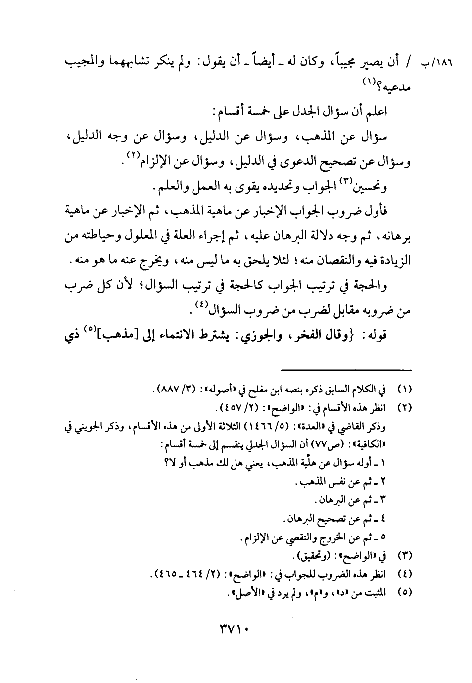 اعْلَم أَن سُؤال الجدل على خَمْسَة أَقسَام: سُؤال عَن الْمَذْهَب، وسؤال عَن الدَّلِيل وسؤال عَن وَجه الدَّلِيل، وسؤال عَن تَصْحِيح الدَّعْوَى فِي الدَّلِيل، وسؤال عَن الْإِلْزَام.