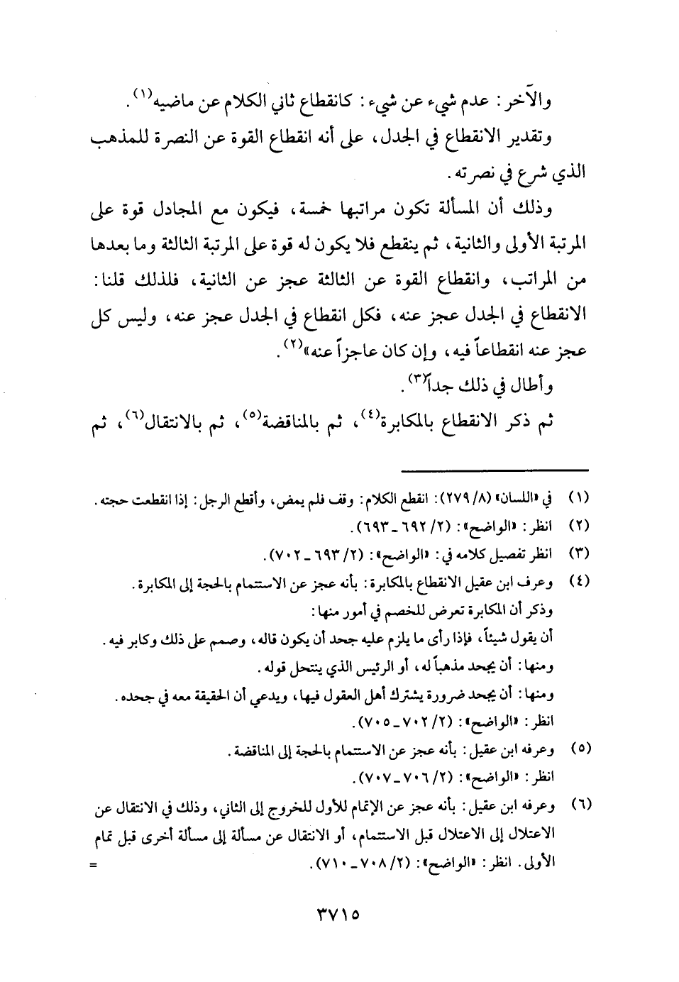 وَذَلِكَ أَن الْمَسْأَلَة تكون مراتبها خَمْسَة، فَيكون مَعَ المجادل قُوَّة على الْمرتبَة الأولى وَالثَّانيَِة، ثمَّ يَنْقَطِع فَلَا يكون لَهُ قُوَّة على الْمرتبَة الثَّالِثَة وَمَا بعْدهَا من الْمَرَاتِب، وَانْقِطَاع الْقُوَّة عَن الثَّالِثَة عجز عَن الثَّانِيَة، فَلذَلِك قُلْنَا: الِانْقِطَاع فِي الجدل عجز عَنهُ، فَكل انْقِطَاع فِي الجدل عجز عَنهُ، وَلَيْسَ كل عجز عَنهُ انْقِطَاعًا فِيهِ، وَإِن كَانَ عَاجِزا عَنهُ ".