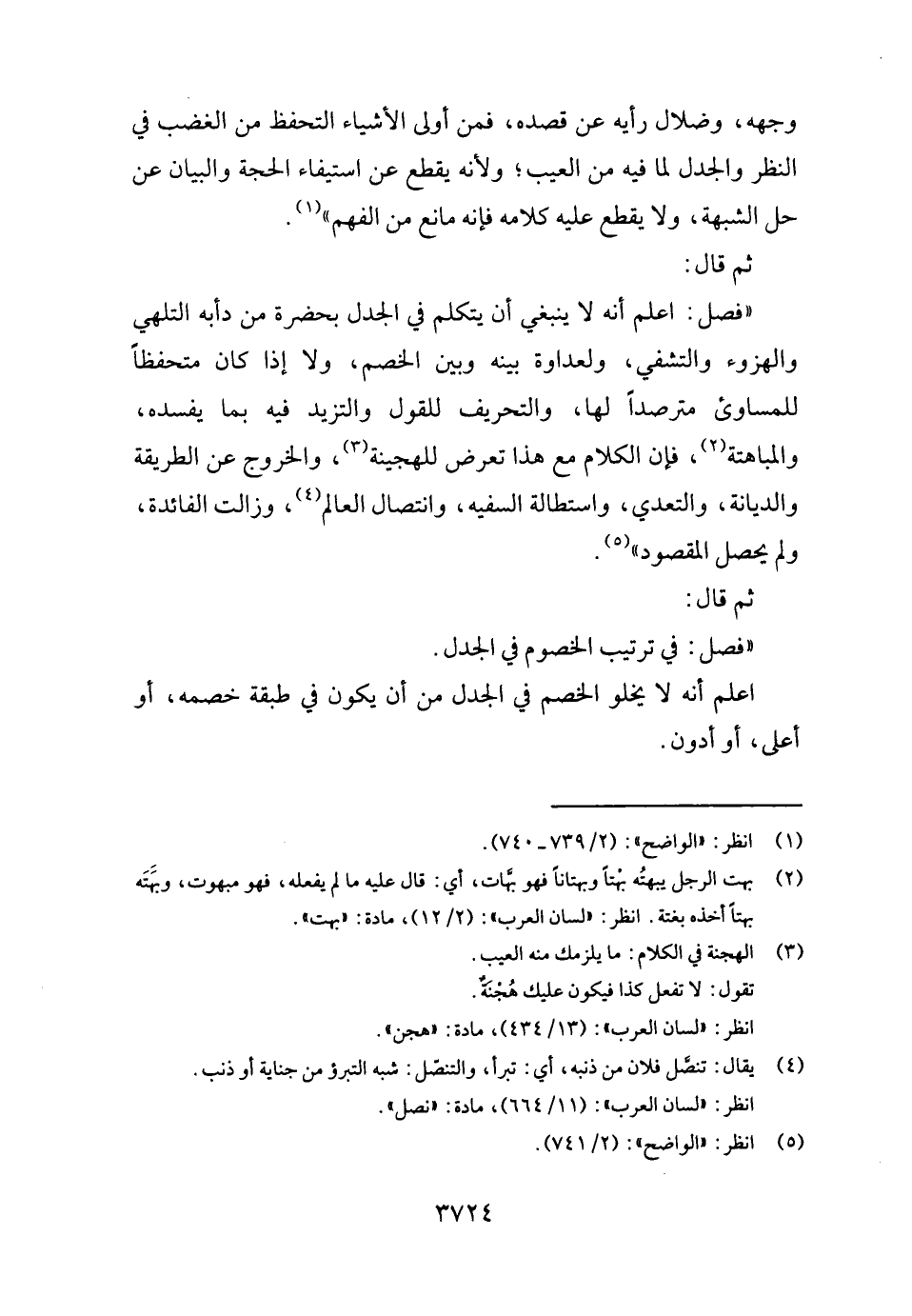 " فصل: اعْلَم أَنه لَا يَنْبَغِي أَن يتَكَلَّم فِي الجدل بِحَضْرَة من دأبه التلهي والهزوء والتشفي، ولعداوة بَينه وَبَين الْخصم، وَلَا إِذا كَانَ متحفظا للمساوئ مترصدا لَهَا، والتحريف لِلْقَوْلِ والتزيد فِيهِ بِمَا يُفْسِدهُ، والمباهتة، فَإِن الْكَلَام مَعَ هَذَا تعرض للهجينة، وَالْخُرُوج عَن الطَّرِيقَة والديانة، والتعدي، واستطالة السَّفِيه، وانتصال الْعَالم، وزالت الْفَائِدَة، وَلم يحصل الْمَقْصُود ".