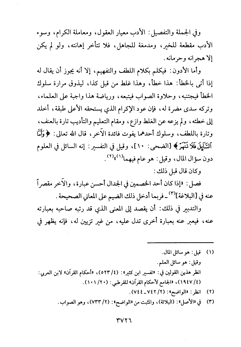 وَأما الأدون: فيكلم بِكَلَام اللطف والتفهيم، إِلَّا أَنه يجوز أَن يُقَال لَهُ إِذا أَتَى بالْخَطَأ: هَذَا خطأ، وَهَذَا غلط من قبل كَذَا، ليذوق مرَارَة سلوك الْخَطَأ فيجتنبه، وحلاوة الصَّوَاب فيتبعه، ورياضة هَذَا وَاجِبَة على الْعلمَاء، وَتَركه سدى مضرَّة لَهُ، فَإِن عود الْإِكْرَام الَّذِي يسْتَحقّهُ الْأَعْلَى طبقَة، أخلد إِلَى خطئه، وَلم يزعه عَن الْغَلَط وازع، ومقام التَّعْلِيم والتأديب تَارَة بالعنف، وَتارَة باللطف، وسلوك أَحدهمَا يفوت فَائِدَة الآخر، قَالَ اللَّهِ تَعَالَى: {وَأما السَّائِل فَلَا تنهر} [الضُّحَى: ١٠] ، وَقيل فِي التَّفْسِير: إِنَّه السَّائِل فِي الْعُلُوم دون سُؤال المَال، وَقيل: هُوَ عَام فيهمَا ".