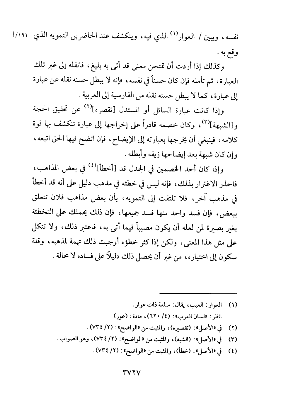 وَإِذا كَانَت عبارَة السَّائِل أَو الْمُسْتَدلّ [تقصره] عَن تَحْقِيق الْحجَّة و [الشُّبْهَة] ، وَكَانَ خَصمه قَادِرًا على إخْرَاجهَا إِلَى عبارَة تنكشف بهَا قُوَّة كَلَامه، فَيَنْبَغِي أَن يُخرجهَا بعبارته إِلَى الْإِيضَاح، فَإِن اتَّضَح فِيهَا الْحق اتبعهُ، وَإِن كَانَ شُبْهَة بعد إيضاحها زيفه وأبطله.