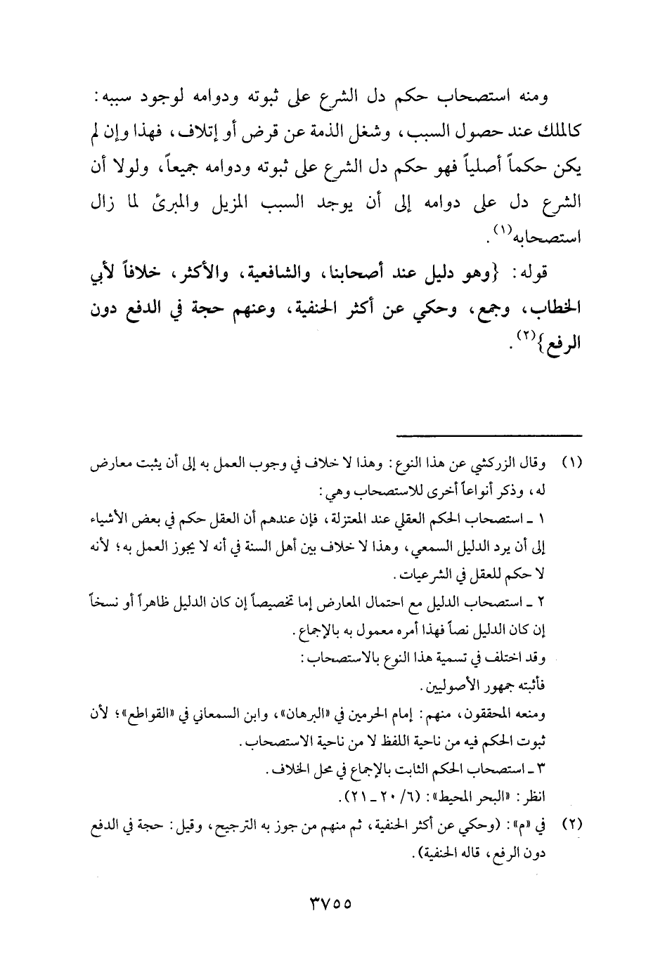 قَوْله: {وَهُوَ دَلِيل عِنْد أَصْحَابنَا، وَالشَّافِعِيَّة، وَالْأَكْثَر، خلافًا لأبي الْخطاب، وَجمع، وَحكي عَن أَكثر الْحَنَفِيَّة، وعنهم حجَّة فِي الدّفع دون الرّفْع} .
