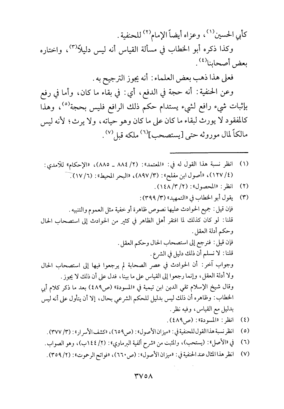 وَعَن الْحَنَفِيَّة: أَنه حجَّة فِي الدّفع، أَي: فِي بَقَاء مَا كَانَ، وَأما فِي رفع بِإِثْبَات شَيْء رَافع لشَيْء يستدام حكم ذَلِك الرافع فَلَيْسَ بِحجَّة، وَهَذَا كالمفقود لَا يُورث لبَقَاء مَا كَانَ على مَا كَانَ وَهُوَ حَيَاته، وَلَا يَرث؛ لِأَنَّهُ لَيْسَ مَالِكًا لمَال مُوَرِثه حَتَّى [يستصحب] ملكه قبل.