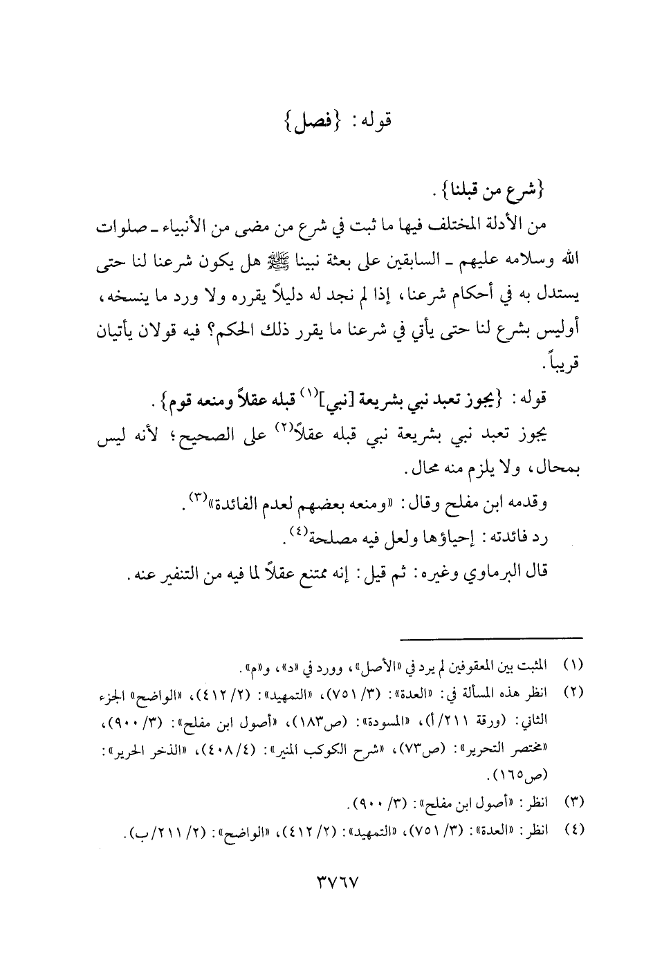 قَوْله: {يجوز تعبد نَبِي بشريعة [نَبِي] قبله عقلا وَمنعه قوم} .