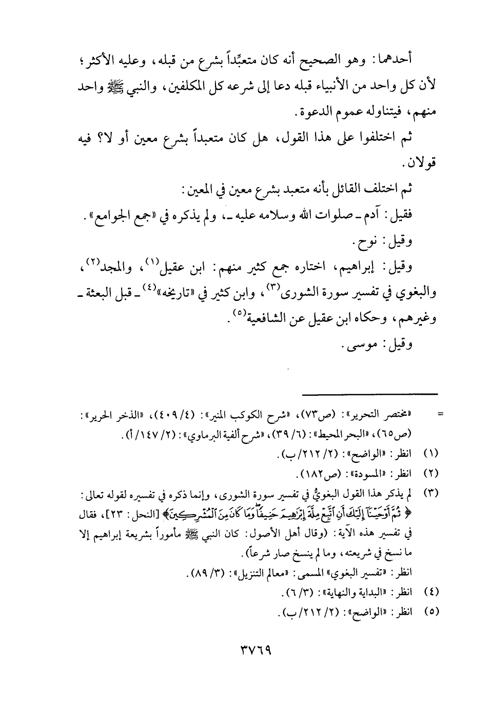 ثمَّ اخْتلفُوا على هَذَا القَوْل، هَل كَانَ متعبدا بشرع معِين أَو لَا؟ فِيهِ قَولَانِ.