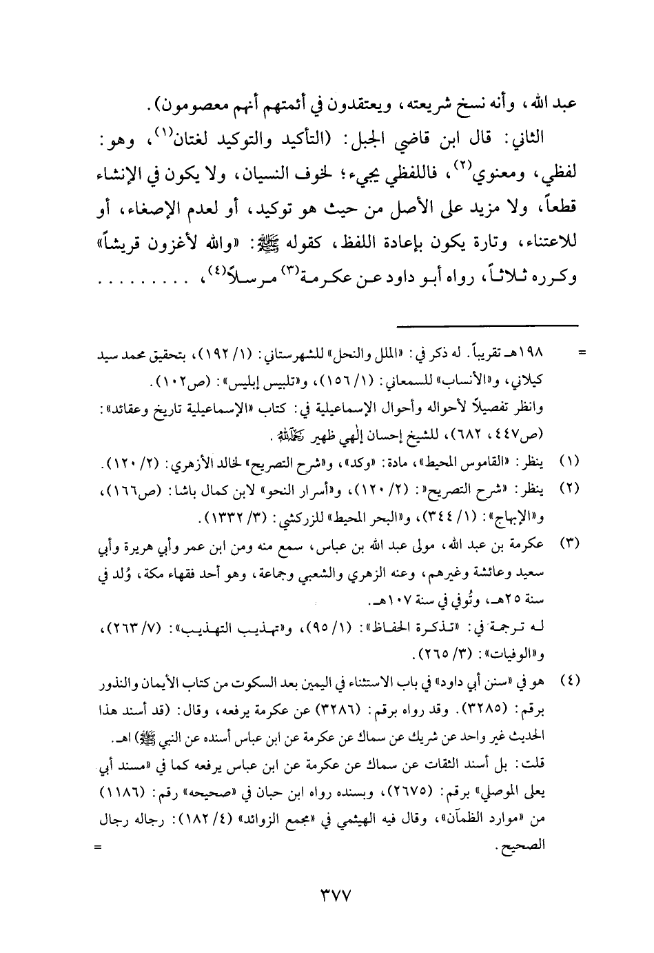 الثَّانِي: قَالَ ابْن قَاضِي الْجَبَل: (التَّأْكِيد والتوكيد لُغَتَانِ، وَهُوَ: لَفْظِي، ومعنوي، فاللفظي يَجِيء؛ لخوف النسْيَان، وَلَا يكون فِي الْإِنْشَاء قطعا، وَلَا مزِيد على الأَصْل من حَيْثُ هُوَ توكيد، أَو لعدم الإصغاء، أَو للاعتناء، وَتارَة يكون بِإِعَادَة اللَّفْظ، كَقَوْلِه - صَلَّى اللَّهُ عَلَيْهِ وَسَلَّم َ -: " وَالله لأغزون قُريْشًا " وكرره ثَلَاثًا، رَوَاهُ أَبُو دَاوُد عَن عِكْرِمَة مُرْسلا، ... ... ... ... ... . .