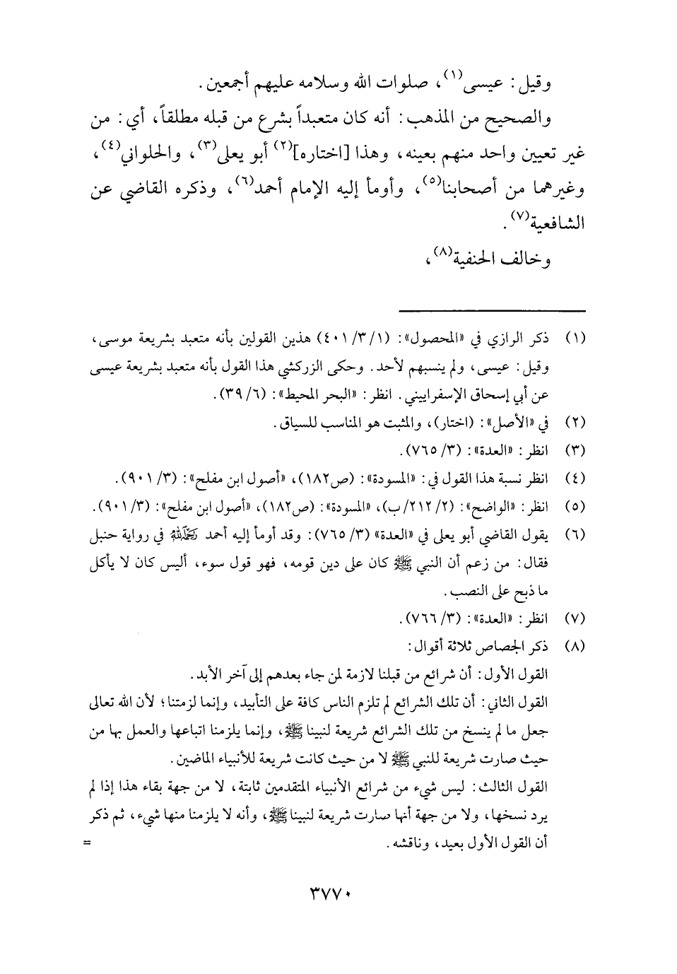 وَالصَّحِيح من الْمَذْهَب: أَنه كَانَ متعبدا بشرع من قبله مُطلقًا، أَي: من غير تعْيين وَاحِد مِنْهُم بِعَيْنِه، وَهَذَا [اخْتَارَهُ] أَبُو يعلى، والحلواني، وَغَيرهمَا من أَصْحَابنَا، وَأَوْمَأَ إِلَيْهِ الإِمَام أَحْمد، وَذكره القَاضِي عَن الشَّافِعِيَّة.