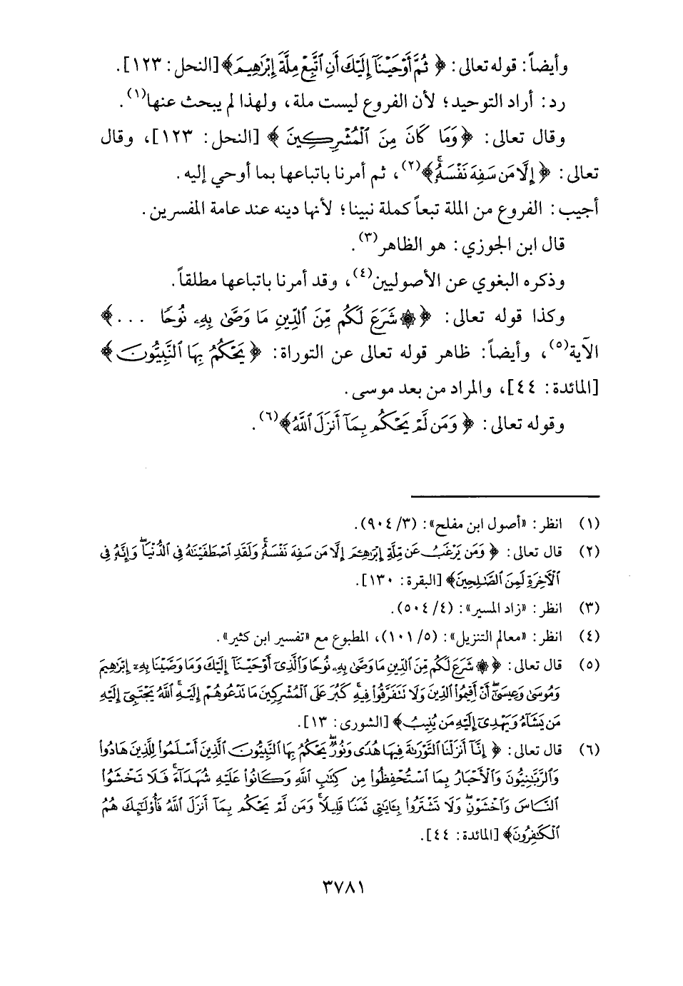 وَقَالَ تَعَالَى: {وَمَا كَانَ من الْمُشْركين} [النَّحْل: ١٢٣] ، وَقَالَ تَعَالَى: {إِلَّا من سفه نَفسه} ، ثمَّ أمرنَا باتباعها بِمَا أُوحِي إِلَيْهِ. أُجِيب: الْفُرُوع من الْملَّة تبعا كملة نَبينَا؛ لِأَنَّهَا دينه عِنْد عَامَّة الْمُفَسّرين.