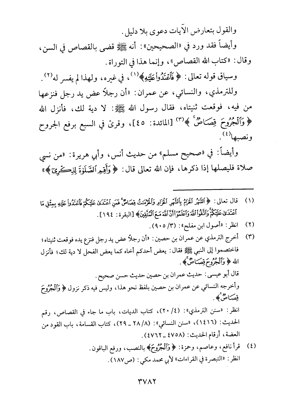 وَأَيْضًا فقد ورد فِي " الصَّحِيحَيْنِ ": أَنه - صَلَّى اللَّهُ عَلَيْهِ وَسَلَّم َ - قضى بِالْقصاصِ فِي السن، وَقَالَ: " كتاب الله الْقصاص "، وَإِنَّمَا هَذَا فِي التَّوْرَاة.