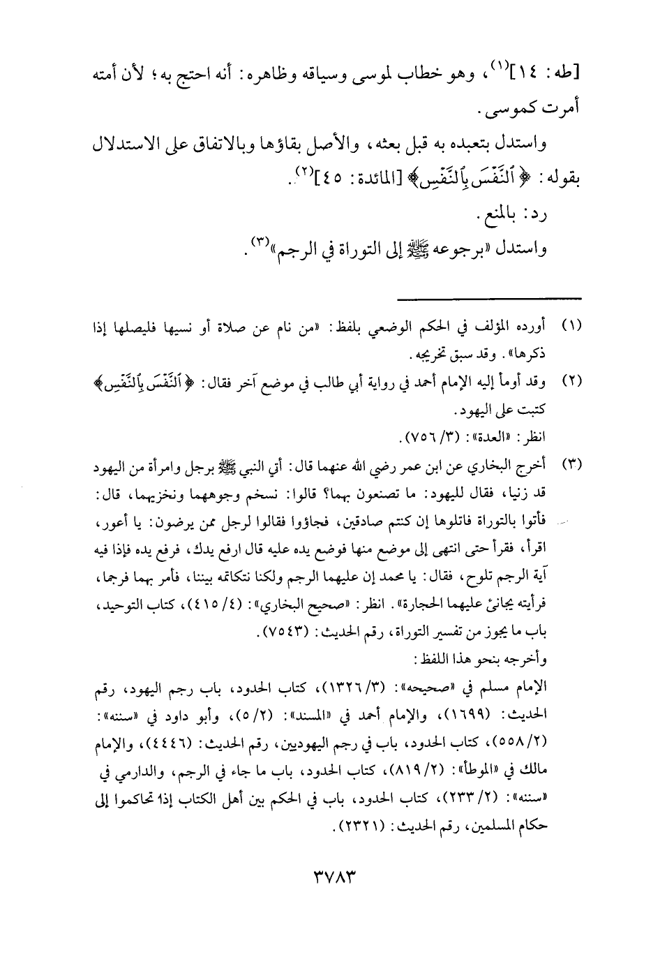 وَاسْتدلَّ " بِرُجُوعِهِ - صَلَّى اللَّهُ عَلَيْهِ وَسَلَّم َ - إِلَى التَّوْرَاة فِي الرَّجْم ".