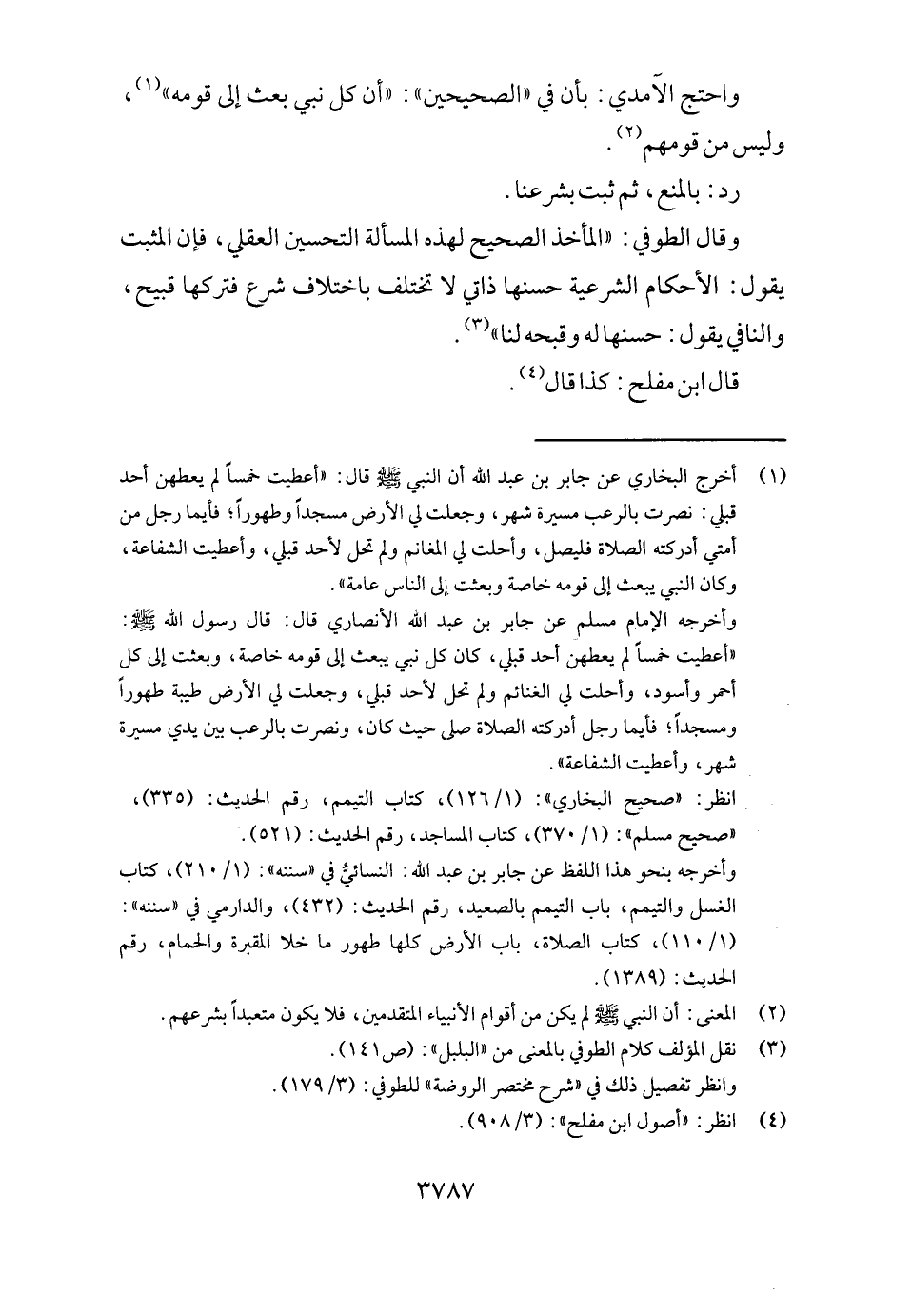 وَقَالَ الطوفي: " المأخذ الصَّحِيح لهَذِهِ الْمَسْأَلَة التحسين الْعقلِيّ فَإِن الْمُثبت يَقُول: الْأَحْكَام الشَّرْعِيَّة حسنها ذاتي لَا تخْتَلف باخْتلَاف شرع فَتَركهَا قَبِيح، والنافي يَقُول: حسنها لَهُ وقبحه لنا ".