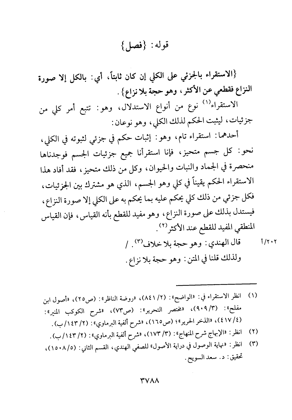 {الاستقراء بالجزئي على الْكُلِّي إِن كَانَ ثَابتا، أَي: بِالْكُلِّ إِلَّا صُورَة النزاع فقطعي عَن الْأَكْثَر، وَهُوَ حجَّة بِلَا نزاع} .