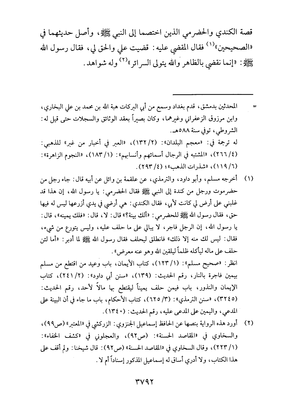 قصَّة الْكِنْدِيّ والحضرمي الَّذين اخْتَصمَا إِلَى النَّبِي - صَلَّى اللَّهُ عَلَيْهِ وَسَلَّم َ -، وأصل حَدِيثهمَا فِي " الصَّحِيحَيْنِ " فَقَالَ الْمقْضِي عَلَيْهِ: قضيت عَليّ وَالْحق لي، فَقَالَ رَسُول الله - صَلَّى اللَّهُ عَلَيْهِ وَسَلَّم َ -: " إِنَّمَا نقضي بِالظَّاهِرِ وَالله يتَوَلَّى السرائر " وَله شَوَاهِد.