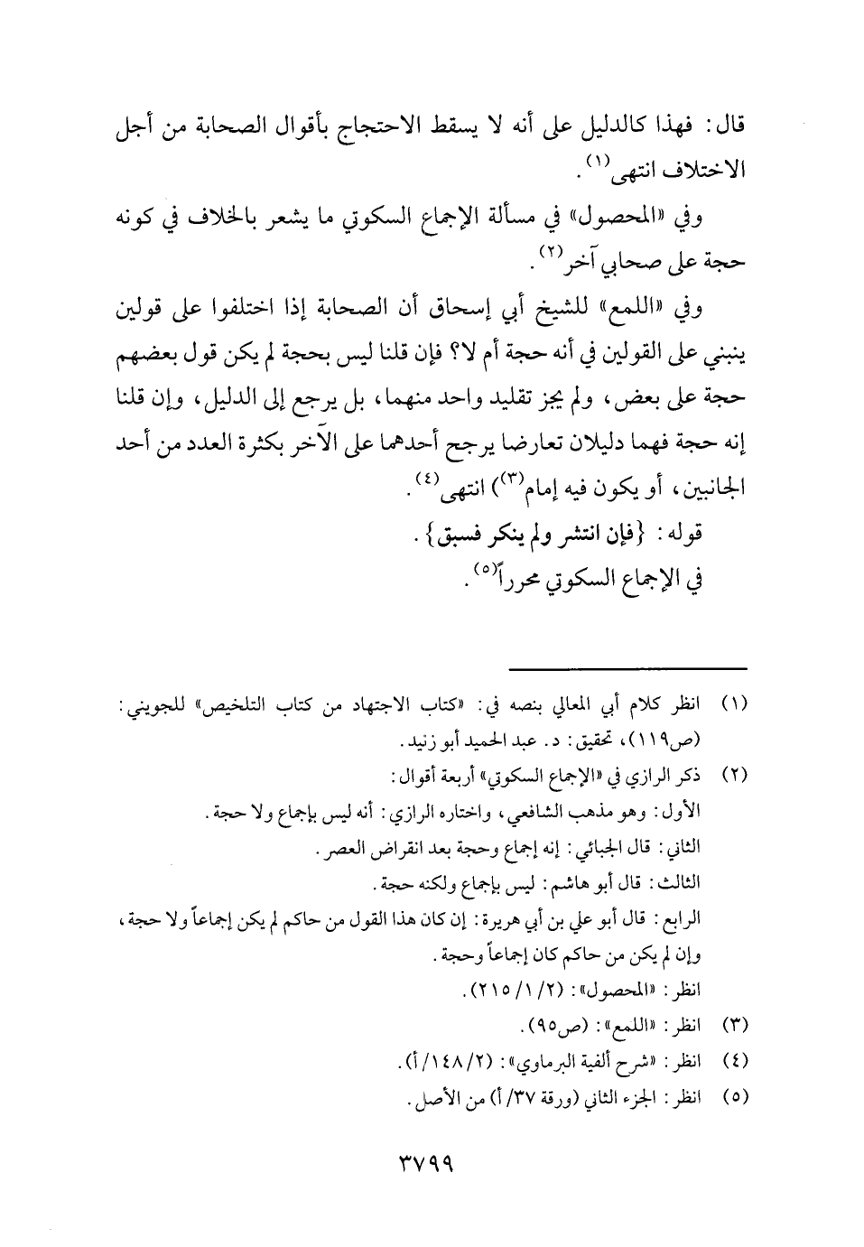 وَفِي " الْمَحْصُول " فِي مَسْأَلَة الْإِجْمَاع السكوتي مَا يشْعر بِالْخِلَافِ فِي كَونه حجَّة على صَحَابِيّ آخر.