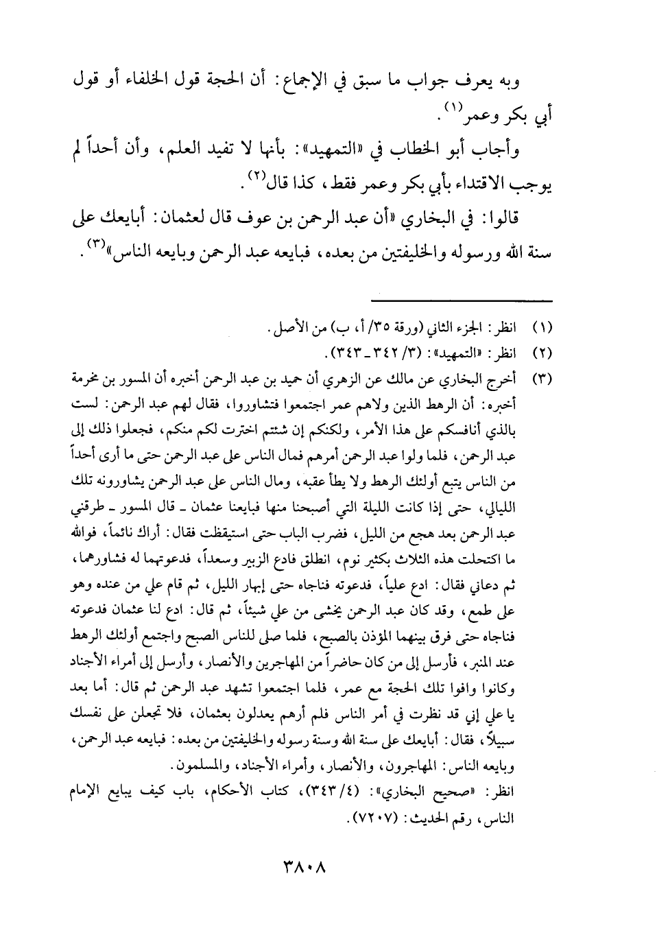 قَالُوا: فِي البُخَارِيّ " أَن عبد الرَّحْمَن بن عَوْف قَالَ لعُثْمَان: أُبَايِعك على سنة الله وَرَسُوله والخليفتين من بعده، فَبَايعهُ عبد الرَّحْمَن وَبَايَعَهُ النَّاس ".