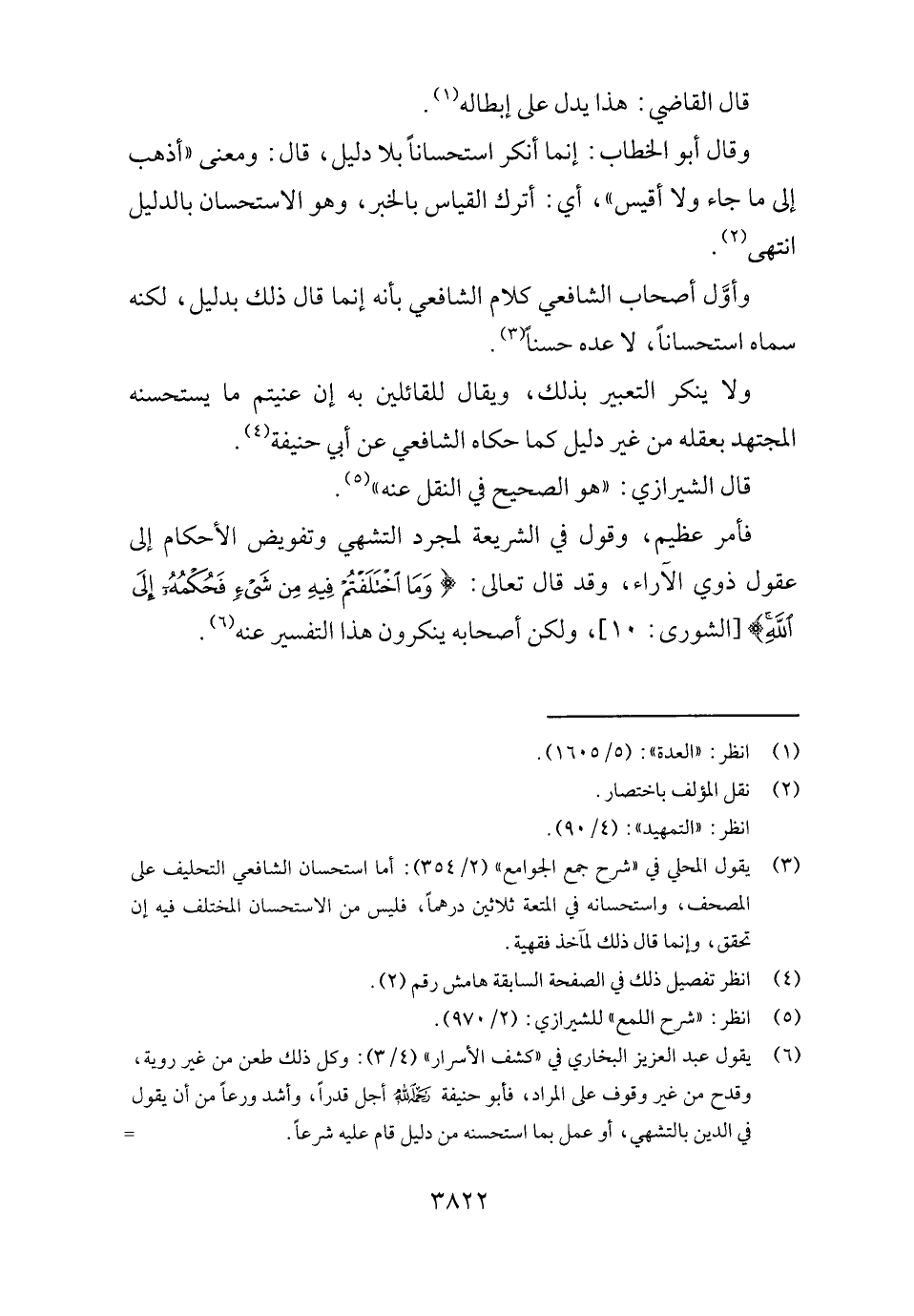 فَأمر عَظِيم، وَقَول فِي الشَّرِيعَة لمُجَرّد التشهي وتفويض الْأَحْكَام إِلَى عقول ذَوي الآراء، وَقد قَالَ تَعَالَى: {وَمَا اختلفتم فِيهِ من شَيْء فَحكمه إِلَى الله} [الشورى: ١٠] ، وَلَكِن أَصْحَابه يُنكرُونَ هَذَا التَّفْسِير عَنهُ.
