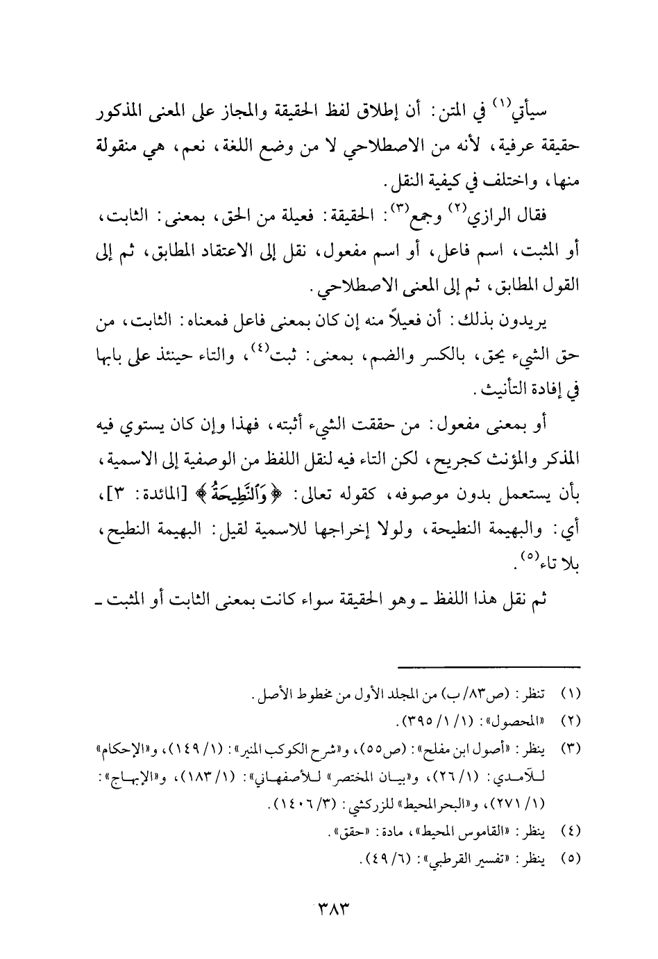 ثمَّ نقل هَذَا اللَّفْظ - وَهُوَ الْحَقِيقَة سَوَاء كَانَت بِمَعْنى الثَّابِت أَو الْمُثبت -