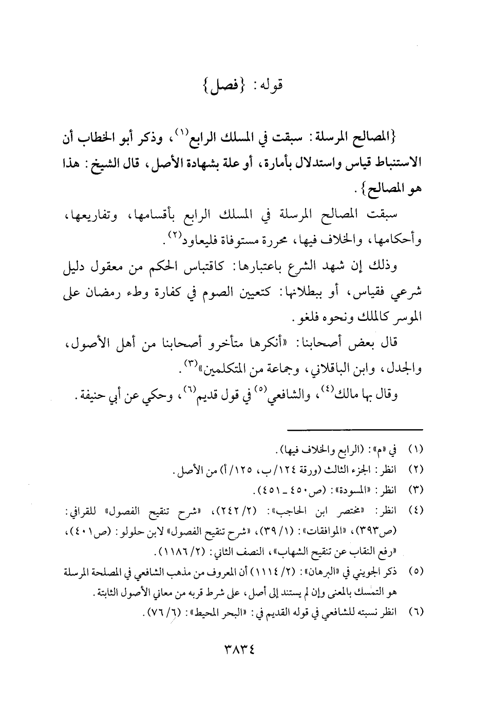 {الْمصَالح الْمُرْسلَة: سبقت فِي المسلك الرَّابِع، وَذكر أَبُو الْخطاب أَن الاستنباط قِيَاس واستدلال بأمارة، أَو عِلّة بِشَهَادَة الأَصْل، قَالَ الشَّيْخ: هَذَا هُوَ الْمصَالح} .